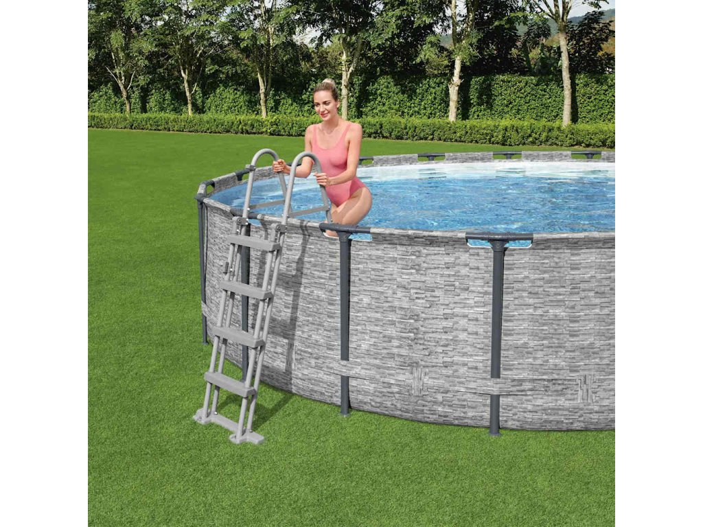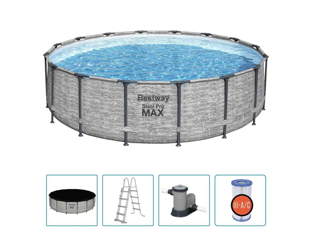 Elektrické filtrační čerpadlo je součástí cirkulačního systému a udržuje bazén čistý. Filtrační kazeta napomáhá prevenci vzniku a množení řas, plísní a dalších mikroorganismů ve vašem bazénu. Bazénové schůdky vám umožní bezpečně do bazénu sestoupit nebo z něj vylézt. Na jedné straně se navíc dají zvednout, takže na ně malé děti nebudou moci vylézt bez dozoru. Pokud ho právě nepoužíváte, dá se bazén snadno rozložit a uskladnit nebo přepravovat.