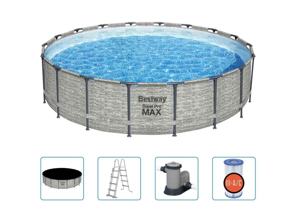 Elektrické filtrační čerpadlo je součástí cirkulačního systému a udržuje bazén čistý. Antimikrobiální filtrační kazeta napomáhá prevenci vzniku a množení řas, plísní a dalších mikroorganismů ve vašem bazénu. Bazénové schůdky vám umožní bezpečně do bazénu sestoupit nebo z něj vylézt. Na jedné straně se navíc dají zvednout, takže na ně malé děti nebudou moci vylézt bez dozoru. Pokud ho právě nepoužíváte, dá se bazén snadno rozložit a uskladnit nebo přepravovat.