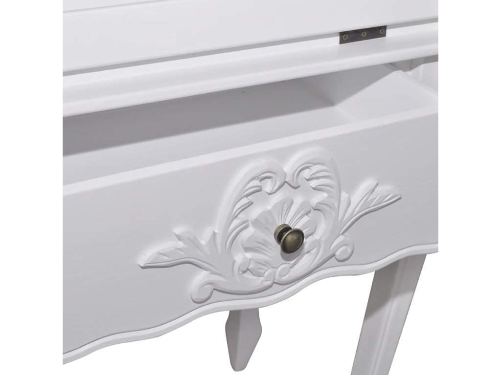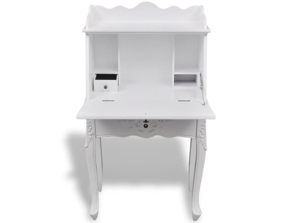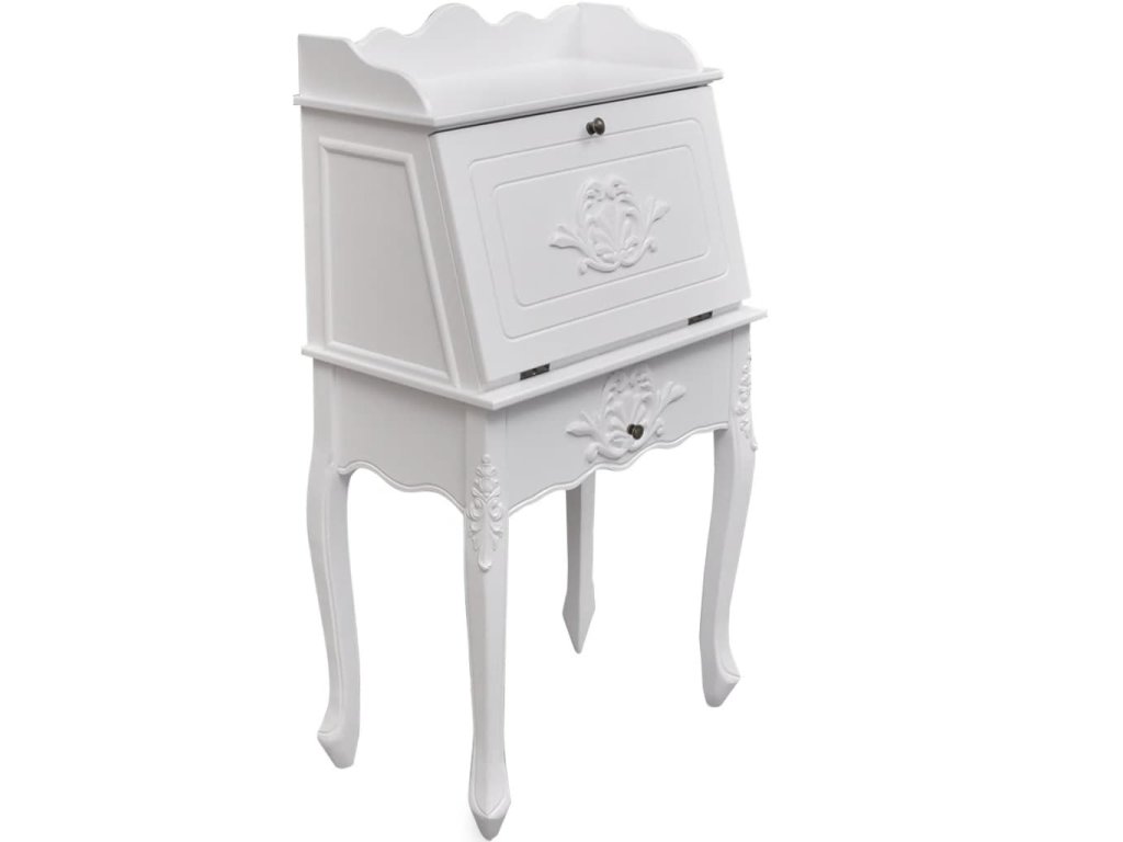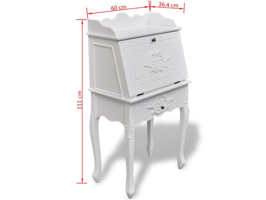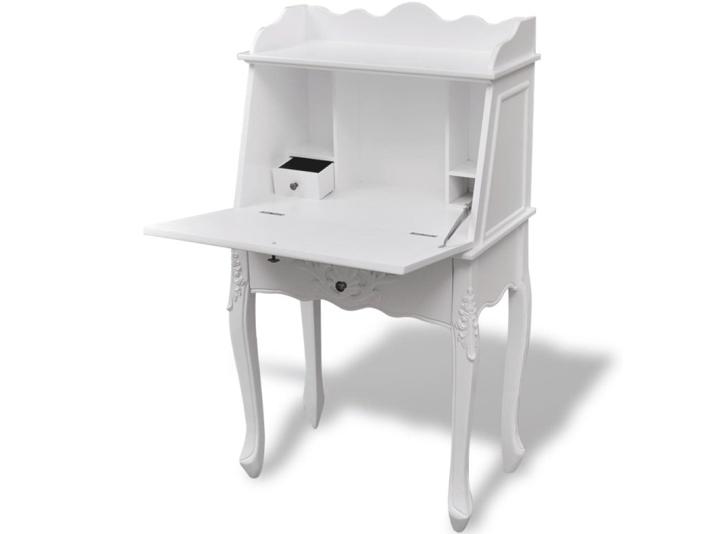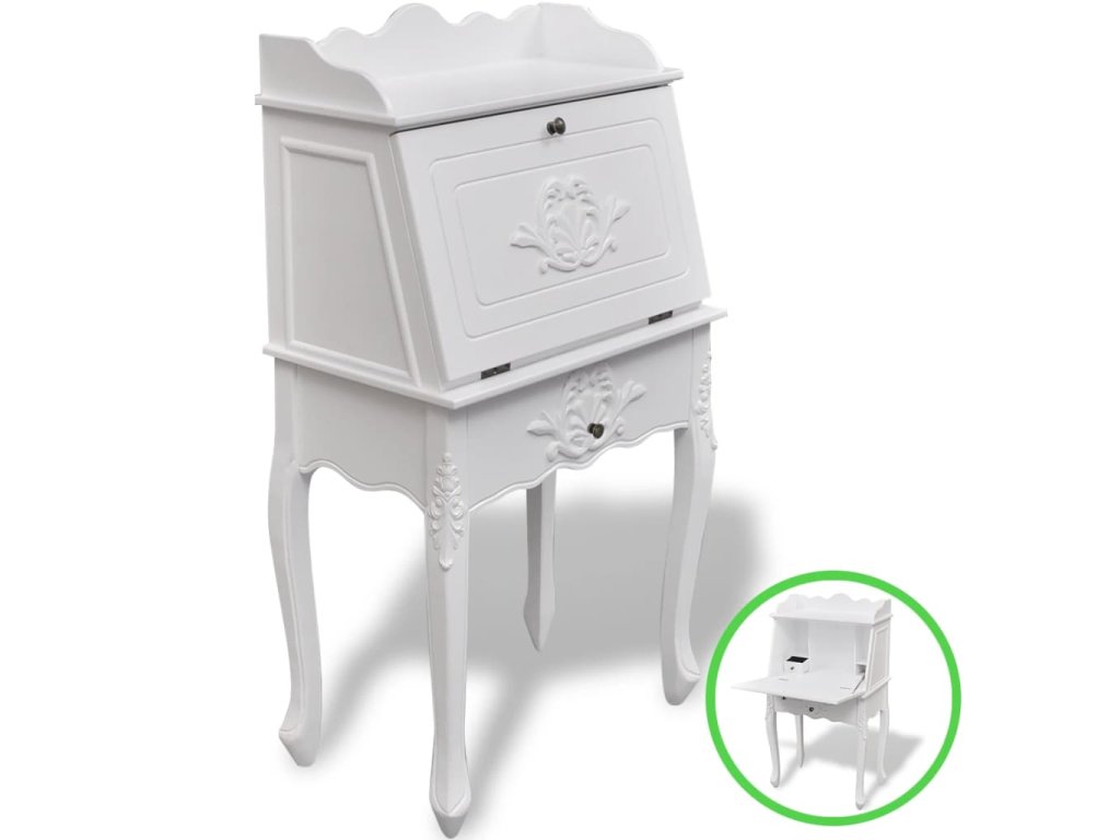 Tento sekretář / psací stůl má panty opatřenou stolní desku, která zároveň funguje jako dvířka kabinetu. Tento psací stůl s malou přihrádkou a policemi má spoustu úložného prostoru na pera a tužky, kancelářské potřeby a další drobnosti.