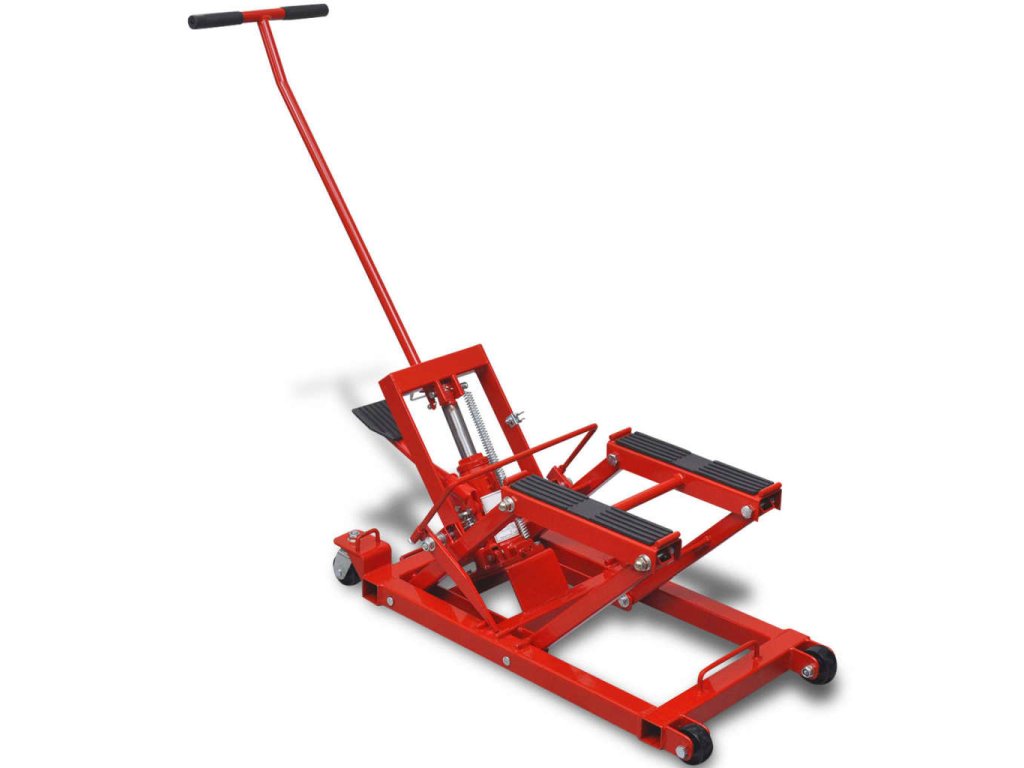 Tento zvedák na motorku má rukojeť ve tvaru T pro snadné ovládání a pohybování. Je vybaven 2 pevnými kolečky a 2 otočnými kolečky, takže se s ním dá snadno popojíždět. Může být složen do plochého tvaru, aby se dal snadno skladovat i v omezeném prostoru.