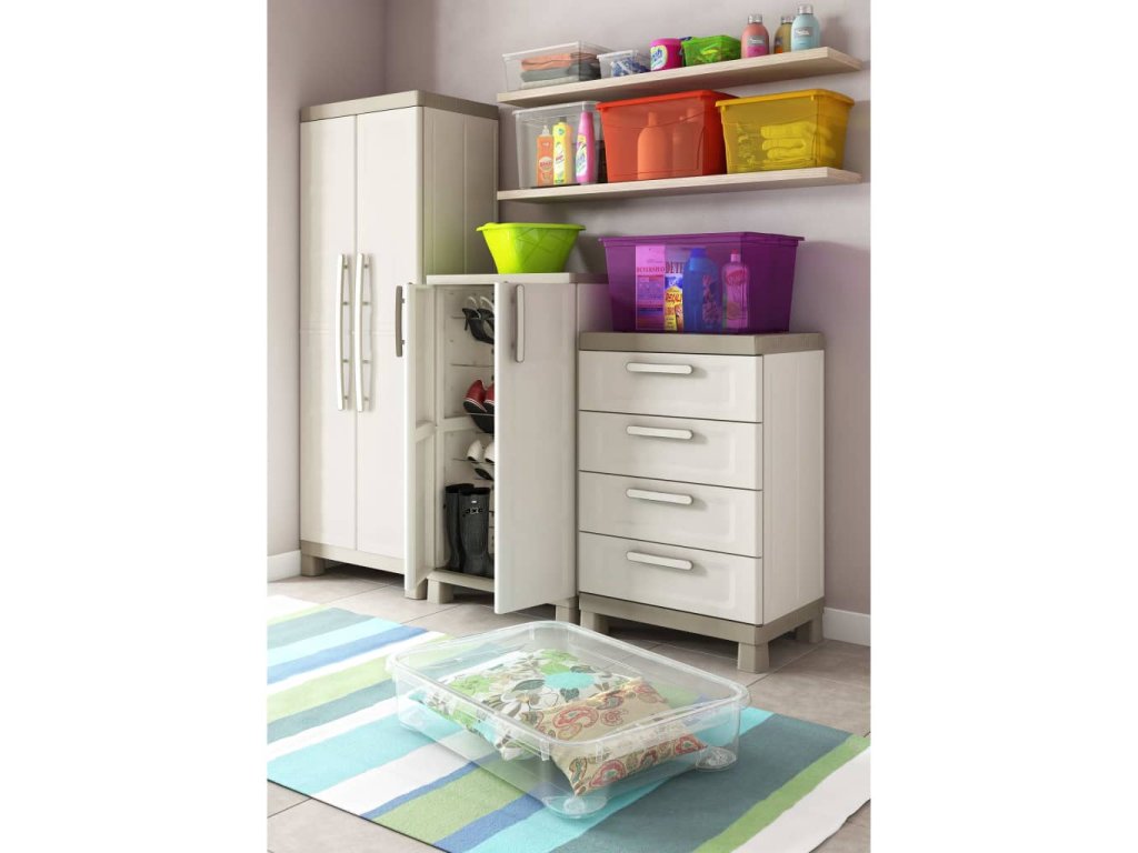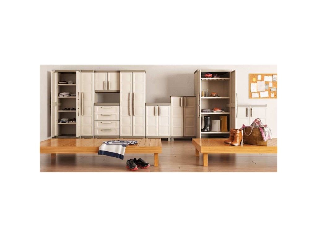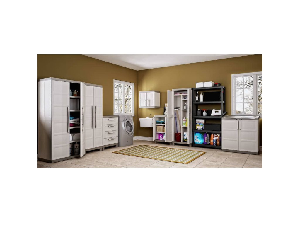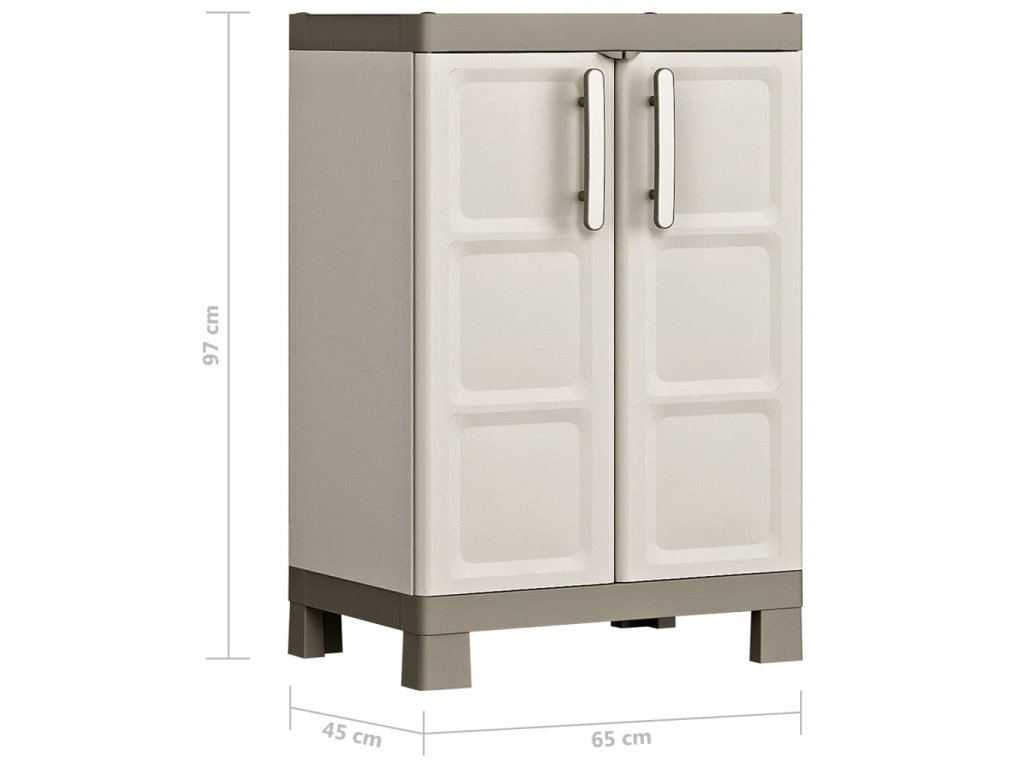 Skříňka s elegantním designem v kontrastních barvách zaujme ve vaší garáži, koupelně nebo ložnici na první pohled. Vzhledem ke svým rozměrům pomáhá šetřit místo, a hodí se tedy zejména do malých prostor, jako například pod schodiště. Nízká skříňka je vybavená 2 nastavitelnými policemi, z nichž každá unese maximálně 15 kg a uzamykatelnými dvířky s ergonomickými úchytkami. Nabízí perfektní a bezpečné úložné řešení pro celou řadu věcí. Její zvýšené nohy umožňují snadné a praktické čištění podlahy.