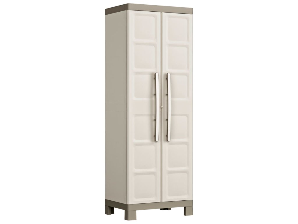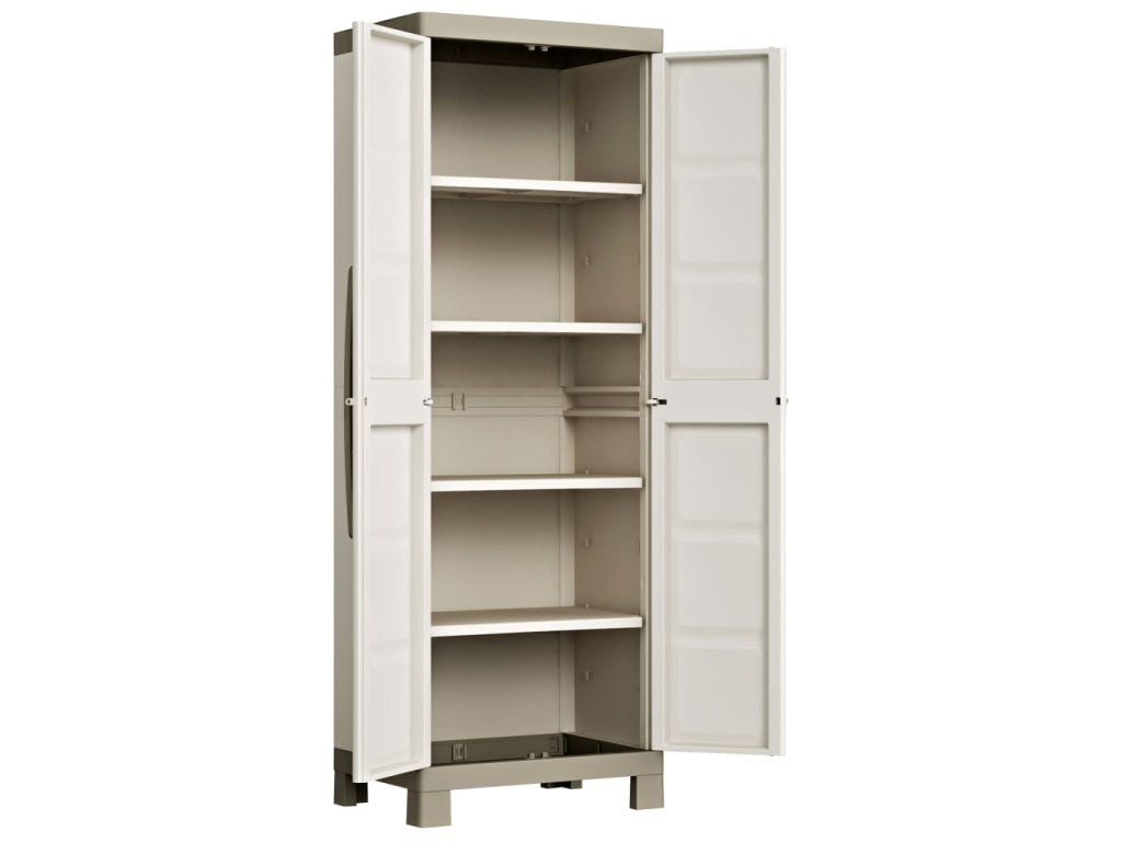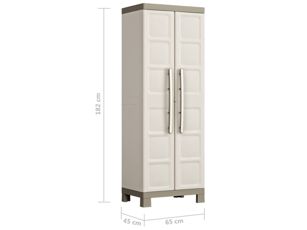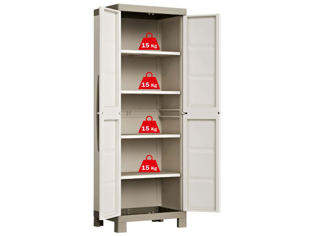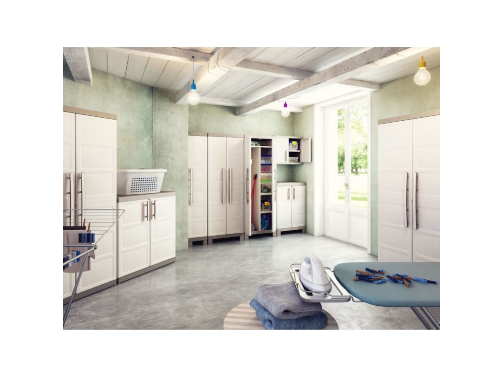 Skříň s elegantním designem v kontrastních barvách zaujme ve vaší garáži, koupelně nebo ložnici na první pohled. Disponuje 4 nastavitelnými policemi, z nichž každá unese maximálně 15 kg, 2 funkčními tácy a uzamykatelnými dvířky s ergonomickými úchytkami. Nabízí perfektní a bezpečné úložné řešení pro celou řadu věcí. Její zvýšené nohy umožňují snadné a praktické čištění podlahy.