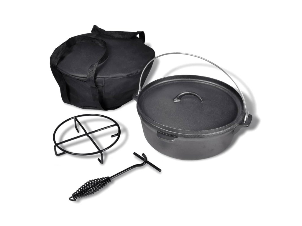 Tento litinový Dutch Oven hrnec s kapacitou 5,6 l je ideální pro začátečníky i experty. Hrnec může být použit pro výrobu husté polévky , omáčky, pečenky , atd. Tento litinový Dutch Oven hrnec je dodáván s černým sáčkem , krytem s zvýšenými okraji , víkem zvedáku a stojanu. Je vyroben z vysoce kvalitních materiálů , takže hrnec je velmi odolný . Součástí balení je černá taška pro přenášení a udržovat hrnec čistý během přepravy. Tato litinový hrnec je univerzální nástroj pro použití doma nebo v přírodě a je ideální pro vaření, pečení a smažení .