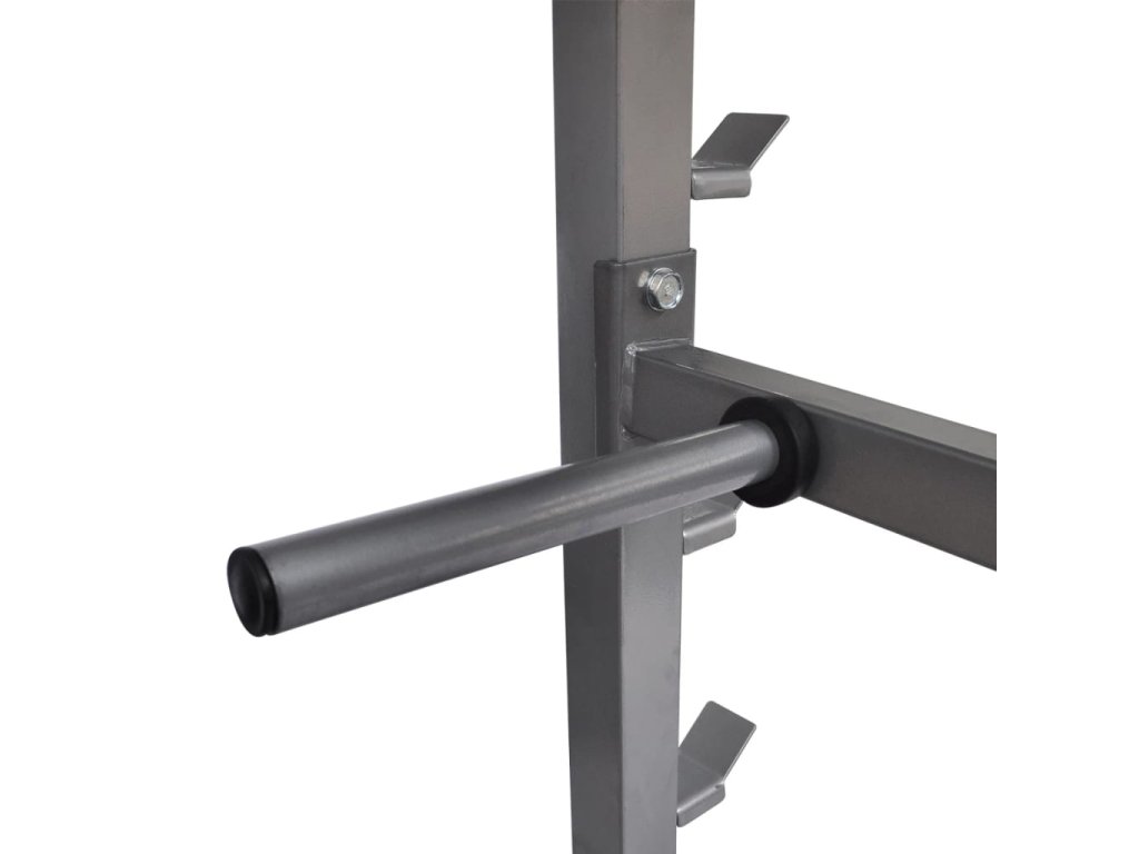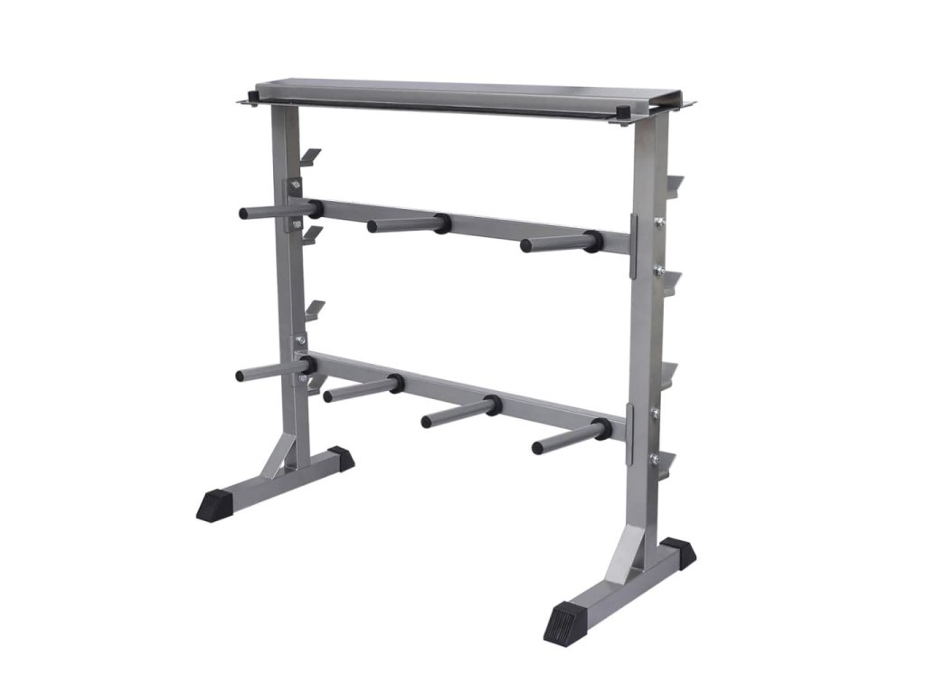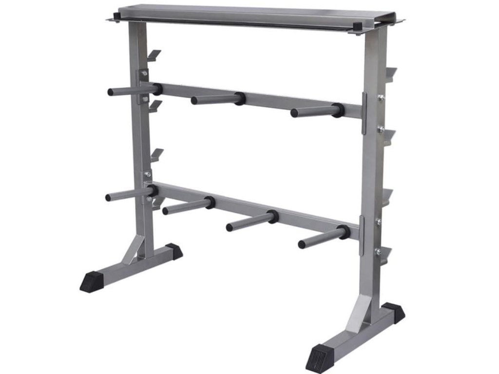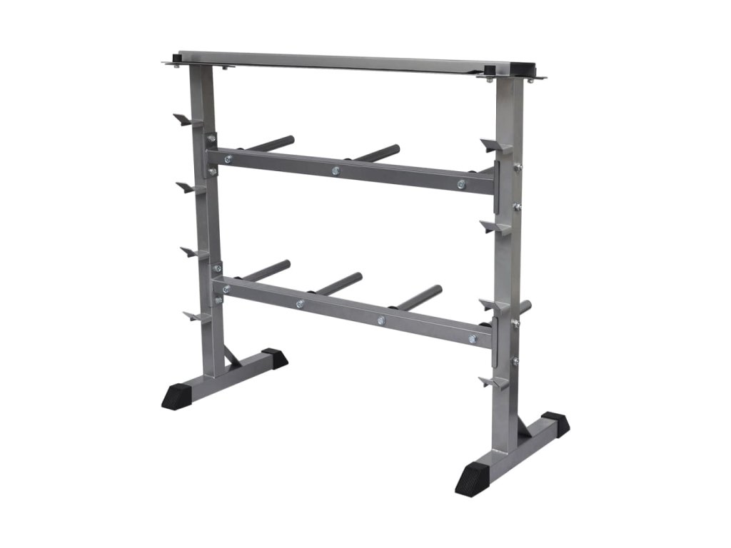 Tento stojan pro činky a závaží je navržen tak , aby udržel činky , závaží a tyče organyzované a nikoli na podlahy . Vychází vstříc většině velikostí a stylů činek , včetně neoprenu a litiny . Stabilní rám se dvěma policemi vám pomůže udržet čistší domácí posilovnu tím , že vám poskytne místo kde zaparkovat činky , když nejsou v použití . Je vyroben z odolné oceli pro roky používání . Protiskluzová gumová základna pomáhá chránit podlahu před poškozením a zajišťuje stabilitu a optimální bezpečnost . Tento stojan s jeho robustní konstrukci má nosnost 300 kg . Je vhodný pro téměř všechny délky tyče . Měří 49x100x95 cm kompletně poskládaný .