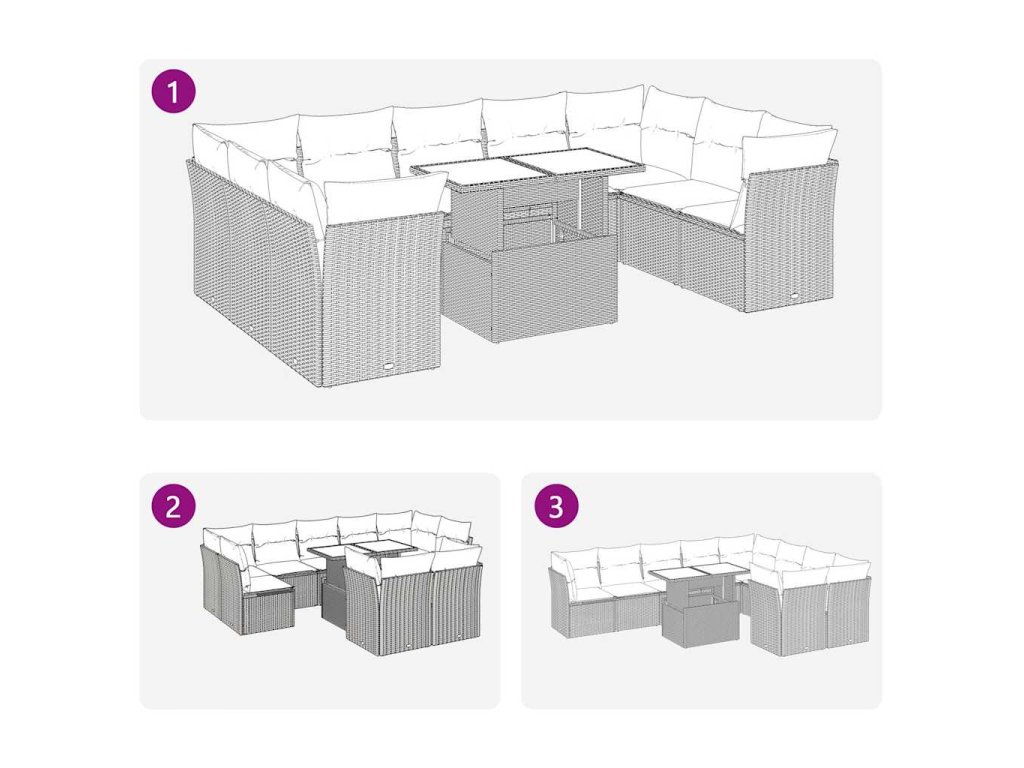 - Modulární design: Tato sada venkovního nábytku se vyznačuje modulární konstrukcí, je tedy zcela flexibilní a lze ji snadno přemisťovat, takže si můžete uspořádat venkovní nábytek dle vašich potřeb.