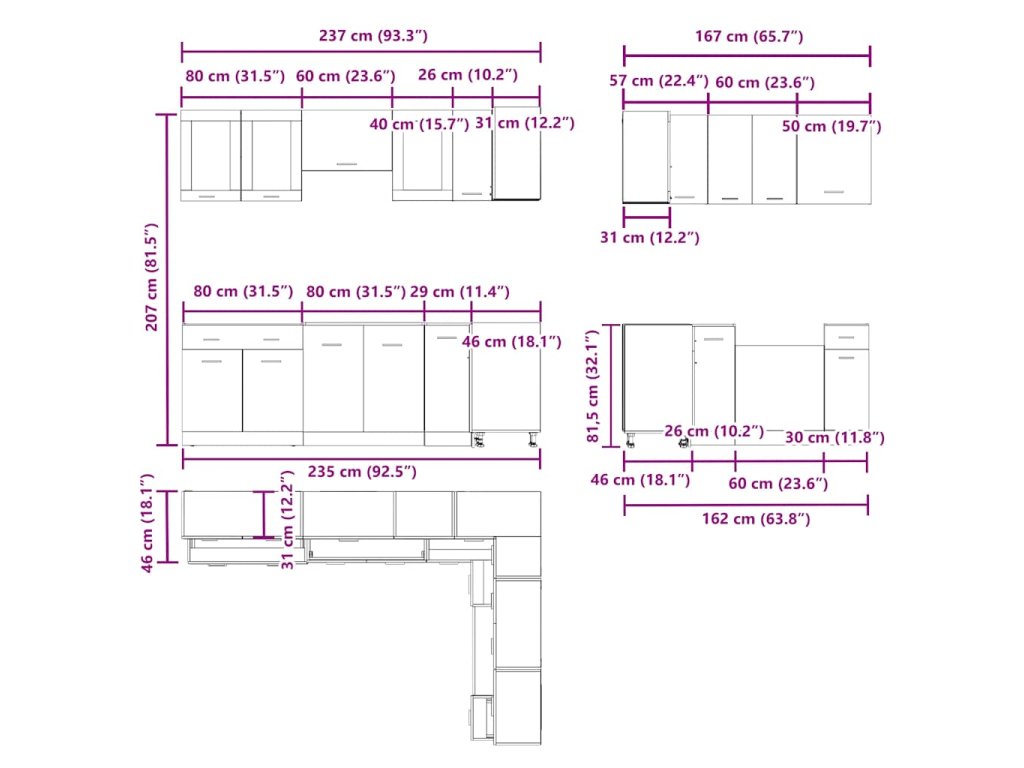 - Dostatek úložného prostoru: Sada kuchyňských skříněk má mnoho přihrádek a nabízí dostatek prostoru pro uložení misek, talířů, hrnců a dalších kuchyňských spotřebičů.
