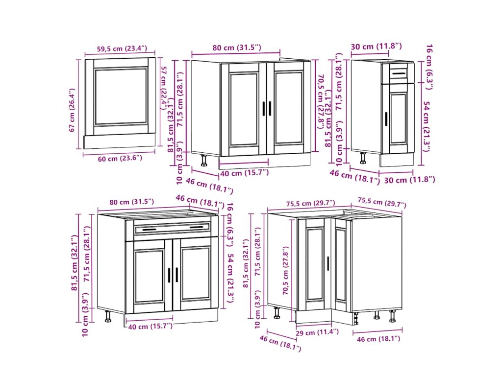 - 1 x kuchyňská rohová spodní skříňka: 75,5 x 75,5 x 81,5 cm (Š x H x V)