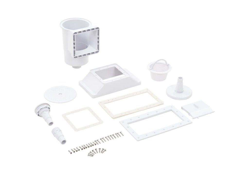 Balení obsahuje 1 skimmer, 1 široké hrdlo, 1 klapku skimmeru, 1 víko skimmeru, 1 vstupní trysku, 1 košík, 1 adaptér, 1 hadicovou přípojku, 3 příruby a další montážní příslušenství.