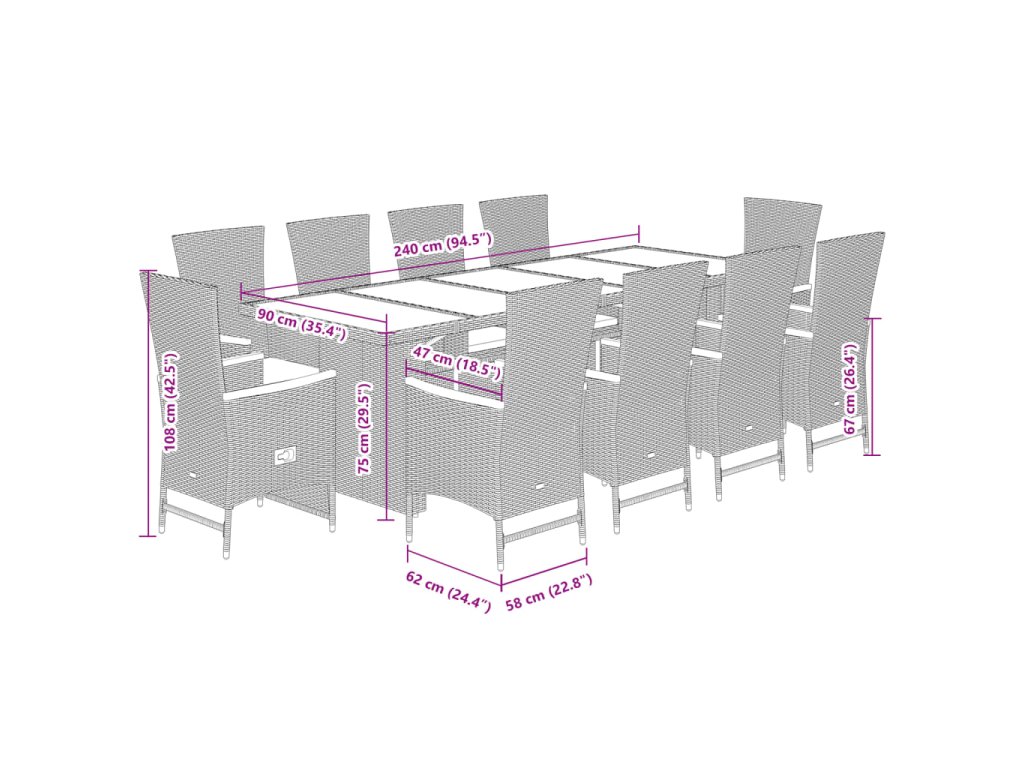 - Rozměry: 240 x 90 x 75 cm (D x Š x V)