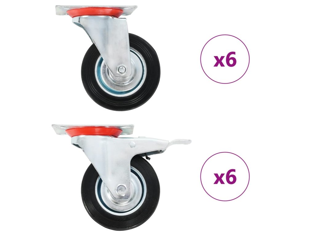 - Balení obsahuje 6 otočných koleček a 6 otočných koleček s brzdou