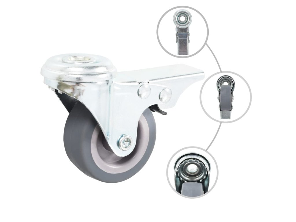 Kolečka jsou vyrobená z TPR (termoplastické gumy), která je známá pro svou schopnost pohlcovat nárazy a vibrace. Ať už tedy kolečka namontujete na cokoliv, budete to moci přesouvat hladce a v tichosti. Jejich hladký povrch navíc ochrání vaši podlahu před poškrábáním. Zinkem potažený ocelový rám je odolný proti rzi, dodává kolečkům na odolnosti a prodlužuje jejich životnost. Otočná kolečka jsou vybavená brzdou pro flexibilnější ovládání. Každé kolečko má maximální nosnost až 35 kg.