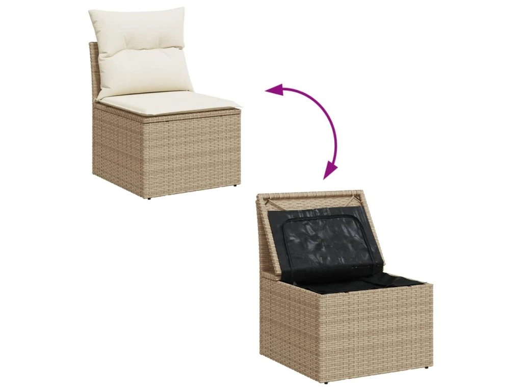 - Úložný prostor s voděodolným vakem: Každý zahradní sedací díl má úložný prostor pod sedákem, který je opatřen voděodolnou vložkou a poslouží vám k ukládání podušek, hraček a dalších věcí. Vnitřní vaky mají horní kryt a lze je bezpečně připevnit k sedákům pomocí suchého zipu, což zaručí větší stabilitu.