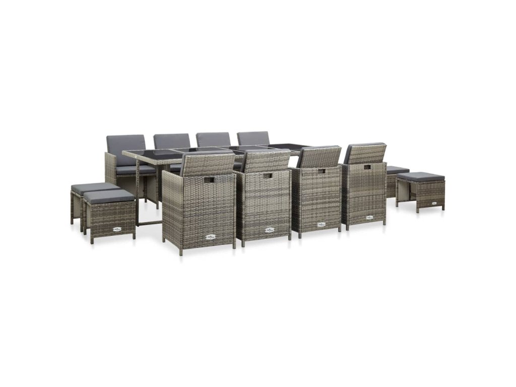 Balení obsahuje 1 stůl, 8 židlí, 4 taburety a 20 polstrů. Poznámka: Doporučujeme vám soupravu za deště, sněhu a mrazu přikrýt.
