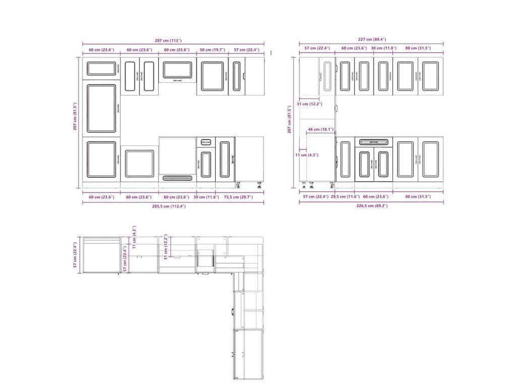 - Dostatek úložného prostoru: Sada kuchyňských skříněk má mnoho přihrádek a nabízí dostatek prostoru pro uložení misek, talířů, hrnců a dalších kuchyňských spotřebičů.