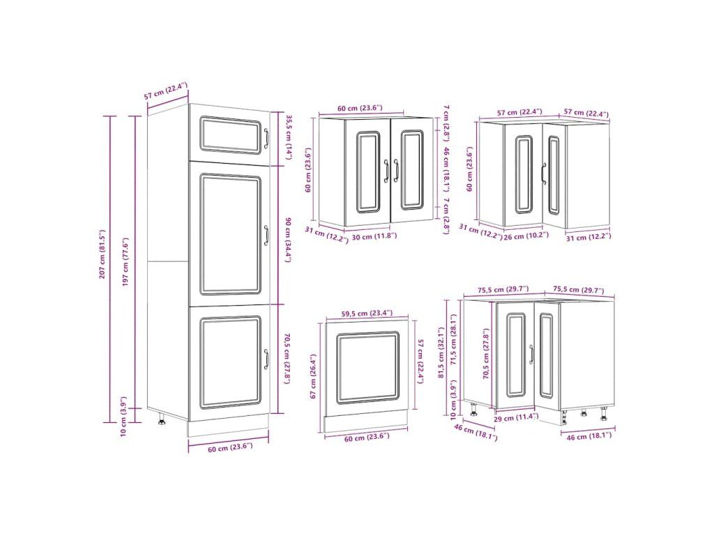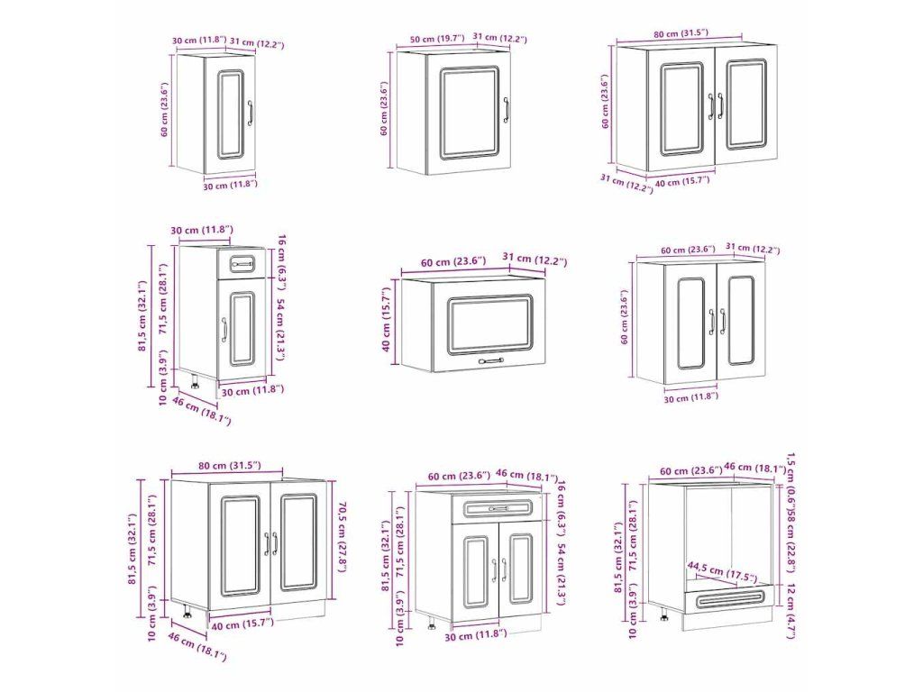 - 1x skříňka na troubu: 60 x 46 x 81,5 cm (Š x H x V)