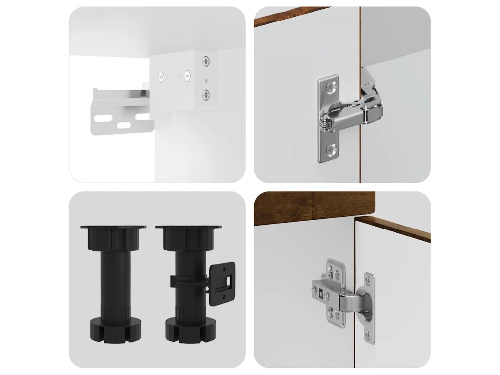 - Nastavitelné nožičky: Spodní skříňky jsou vybaveny nastavitelnými nožičkami, které lze výškově nastavit tak, aby vyhovovaly uspořádání vaší kuchyně.