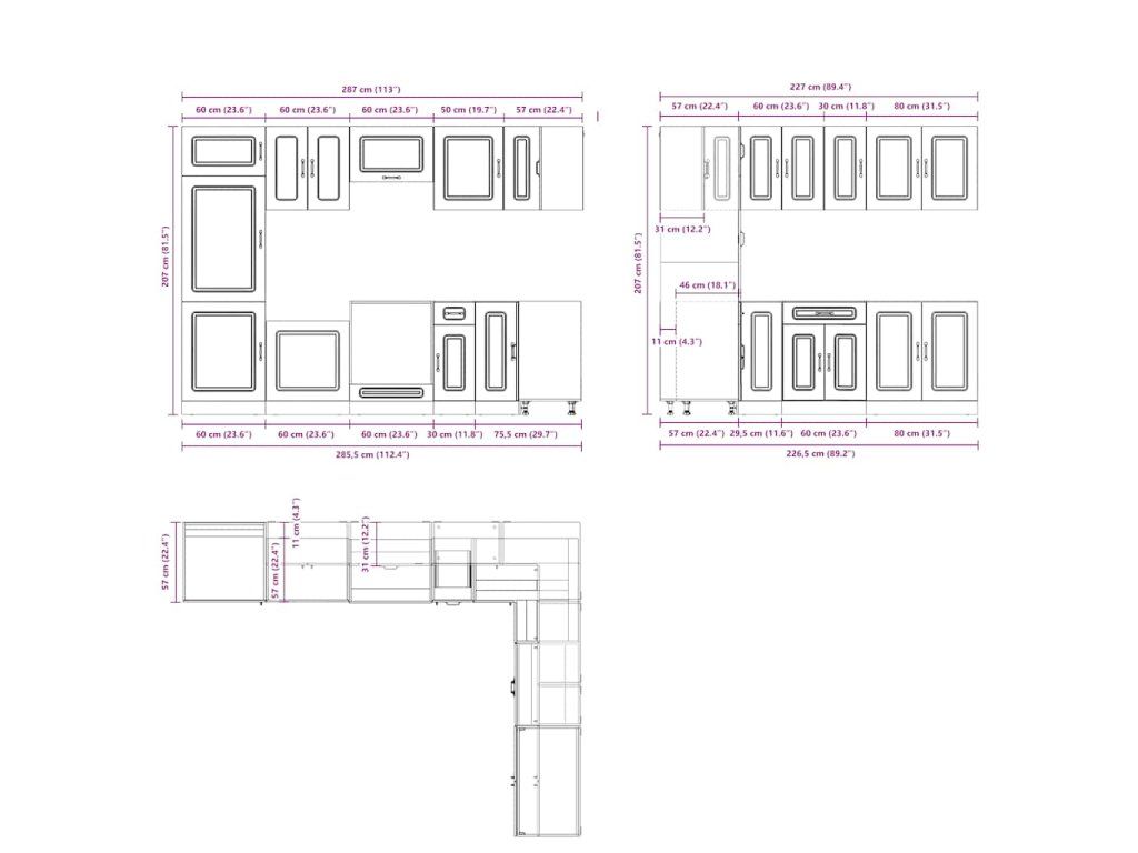 - 1x skříňka na troubu: 60 x 46 x 81,5 cm (Š x H x V)