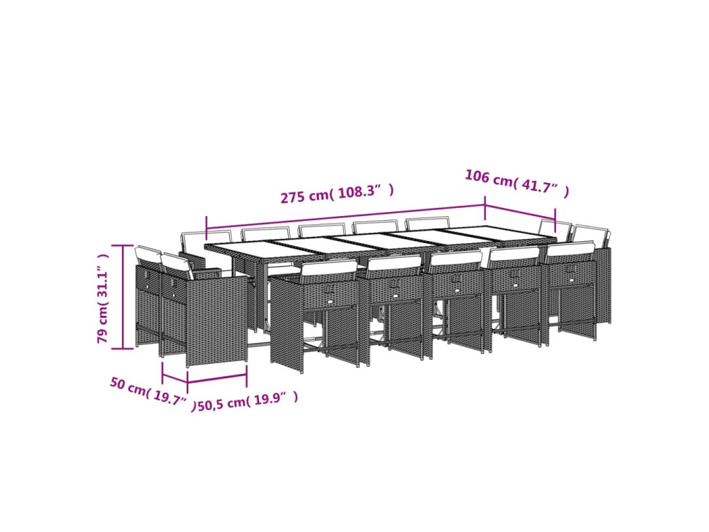 - Materiál: PE ratan, práškově lakovaná ocel, masivní akáciové dřevo s olejovou povrchovou úpravou