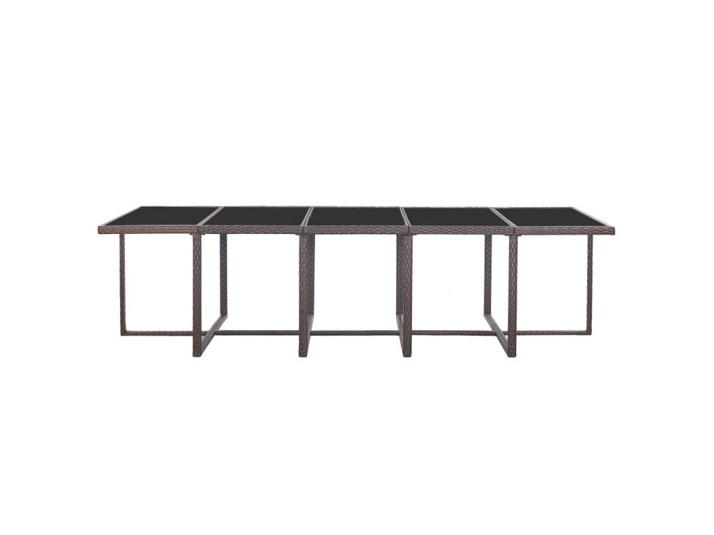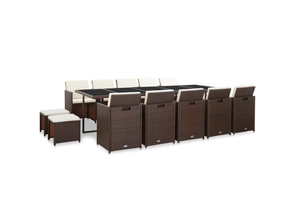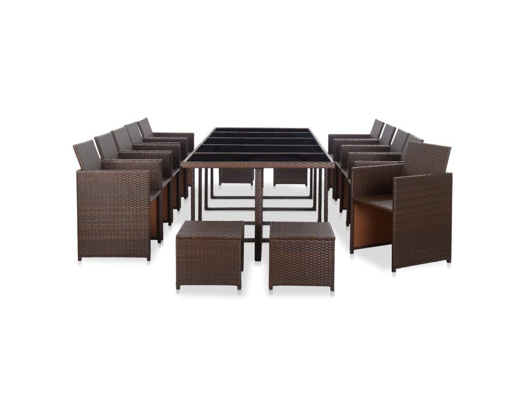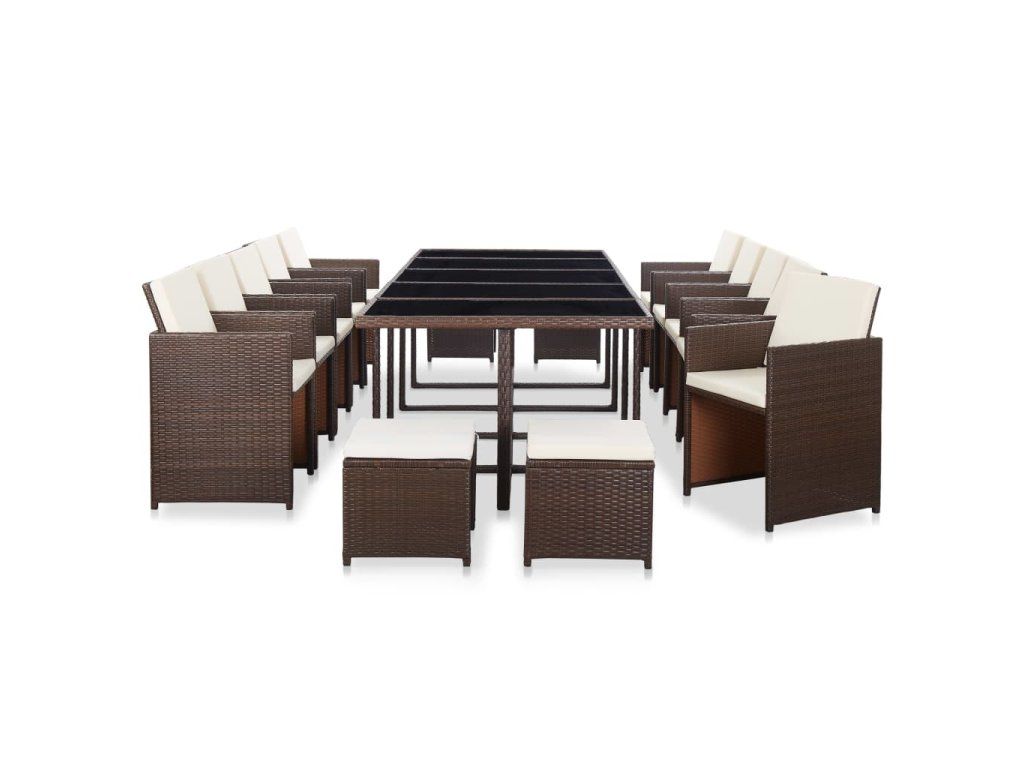 Balení obsahuje 1 stůl se skleněnou deskou, 10 ratanových židlí, 4 stoličky a 24 odnímatelných podušek.