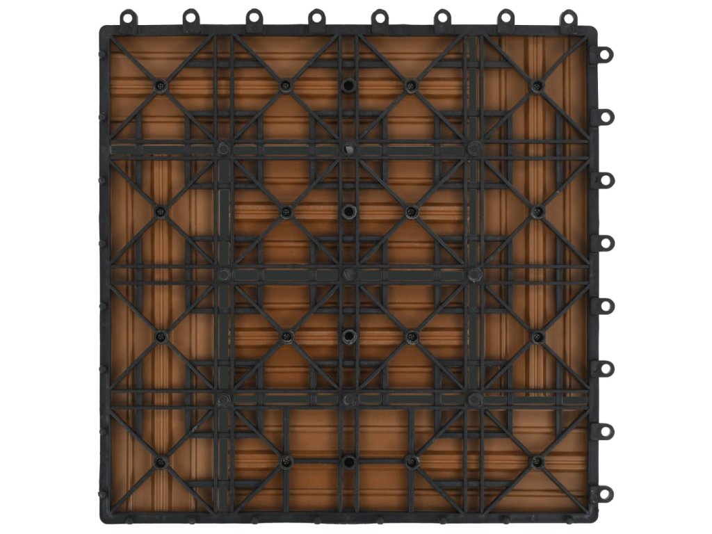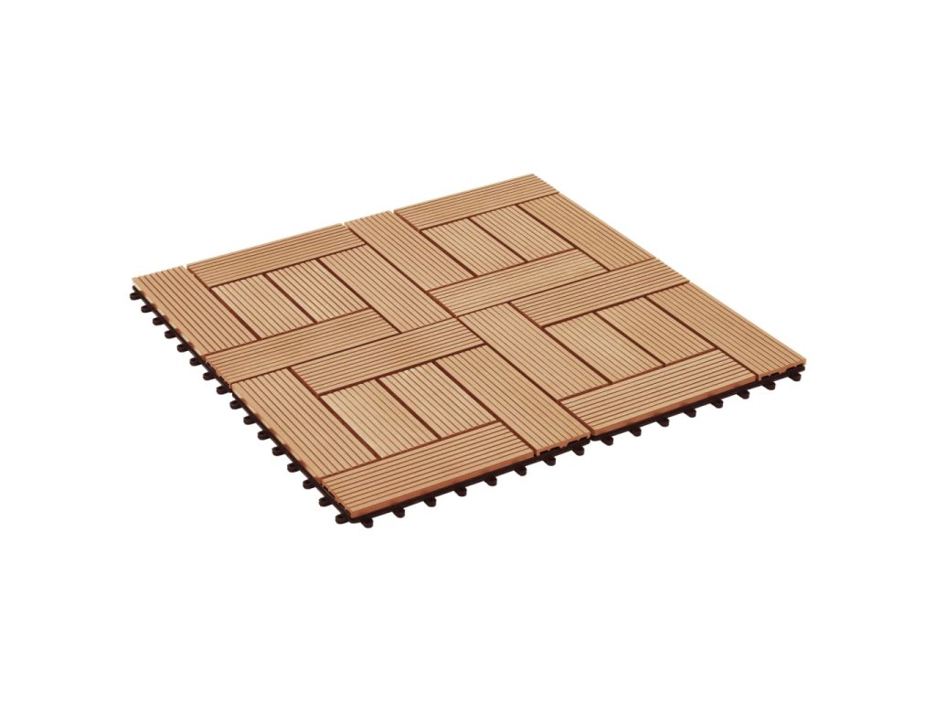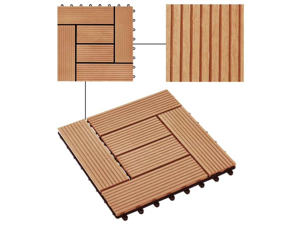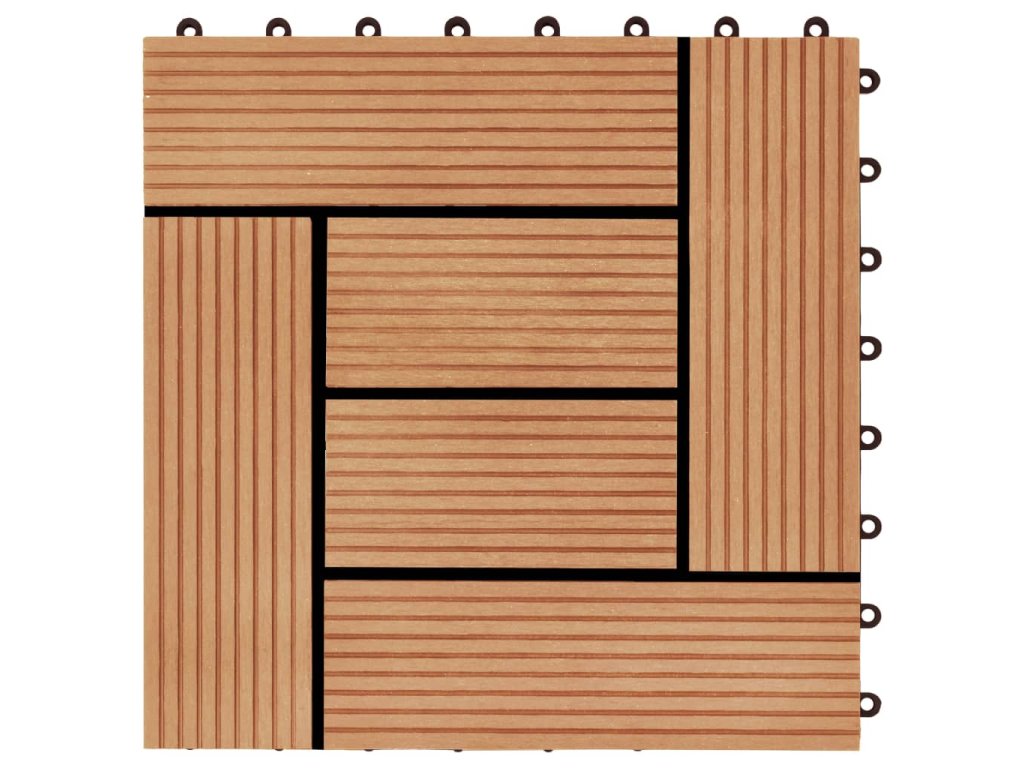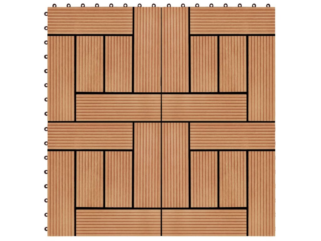 Tuto sadu terasových dlaždic z dřevoplastu tvoří 22 kusů samostatných dlaždic o velikosti 30 x 30 cm, které dohromady pokryjí celkový povrch o rozloze 2 metry čtverečné. Jsou ideální volbou na dvorky a balkony, k bazénu nebo k vířivce anebo třeba do koupelen.