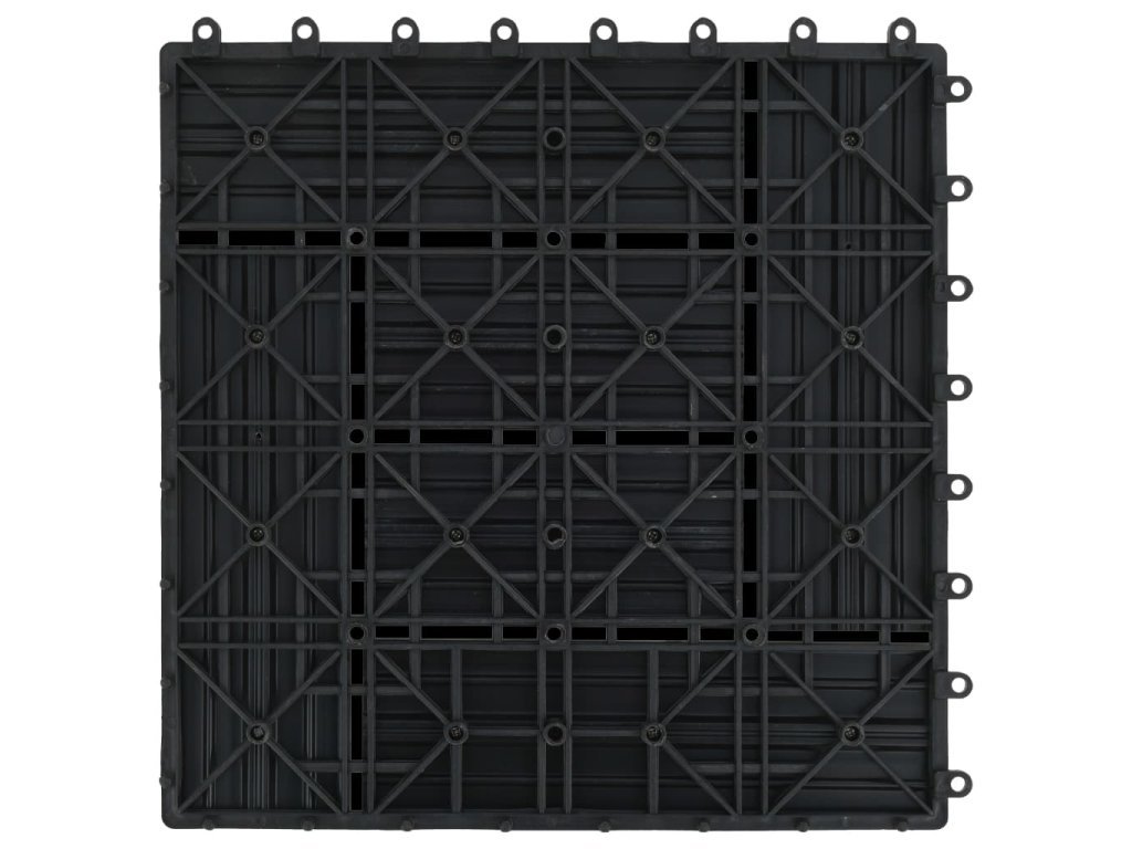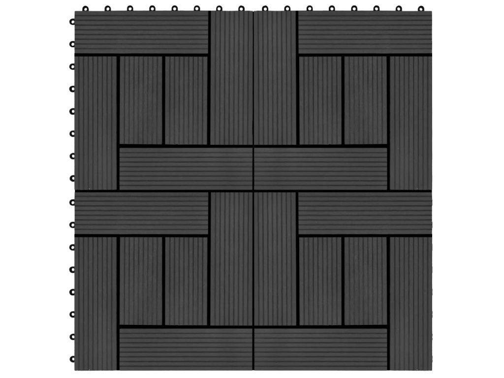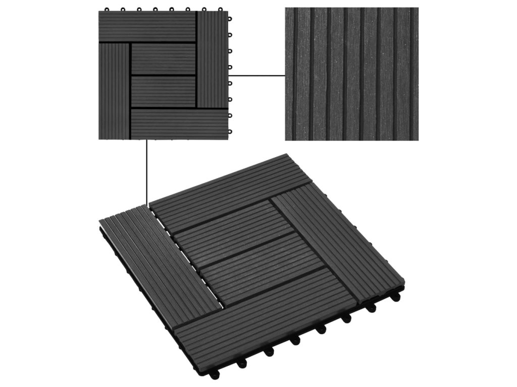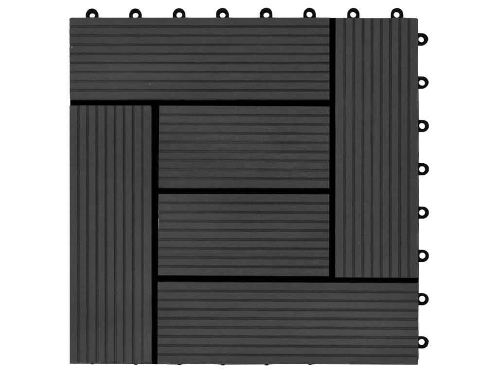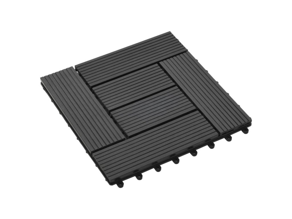 Tuto sadu terasových dlaždic z dřevoplastu tvoří 22 kusů samostatných dlaždic o velikosti 30 x 30 cm, které dohromady pokryjí celkový povrch o rozloze 2 metry čtverečné. Jsou ideální volbou na dvorky a balkony, k bazénu nebo k vířivce anebo třeba do koupelen.