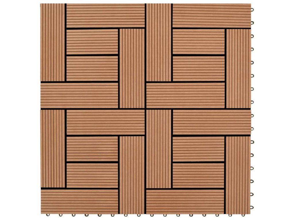 Tato sada terasových dlaždic z dřevoplastu obsahuje 22 kusů samostatných dlaždic o velikosti 30 x 30 cm, které dohromady pokryjí celkový povrch o rozloze 2 metrů čtverečních. Jsou ideální volbou na dvorky, balkony, do koupelny nebo k bazénu či vířivce.