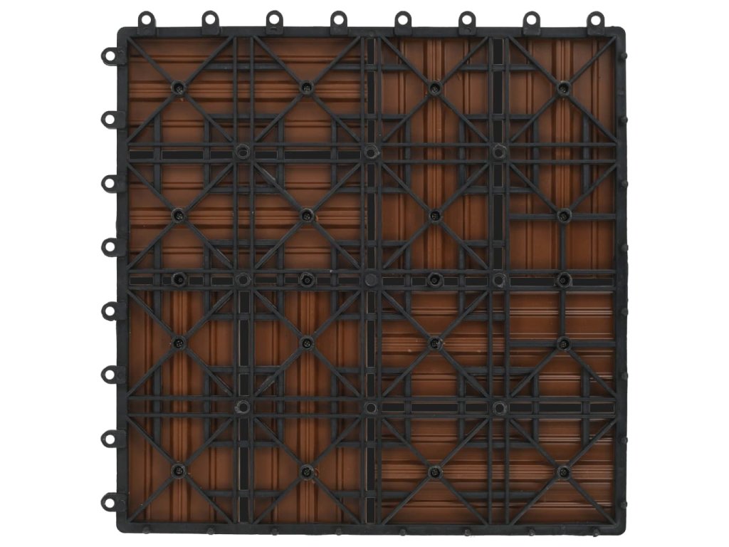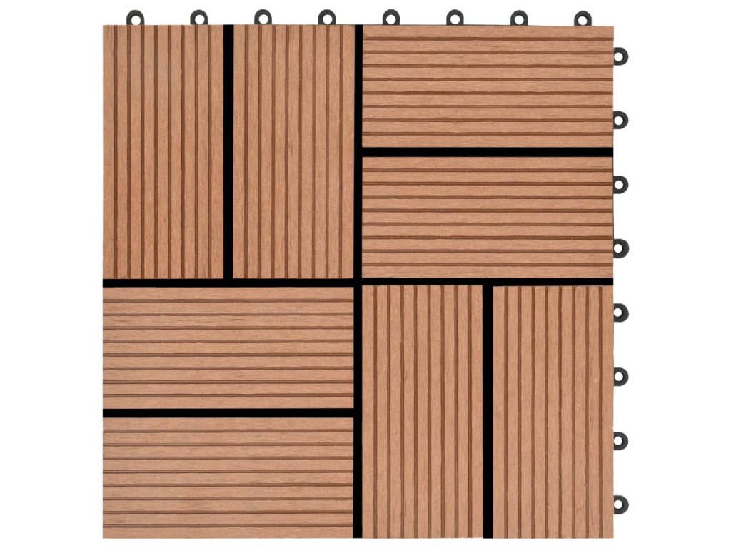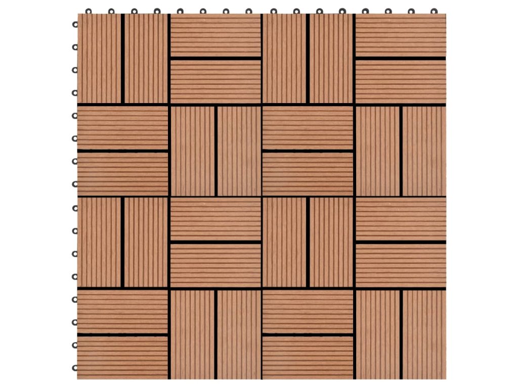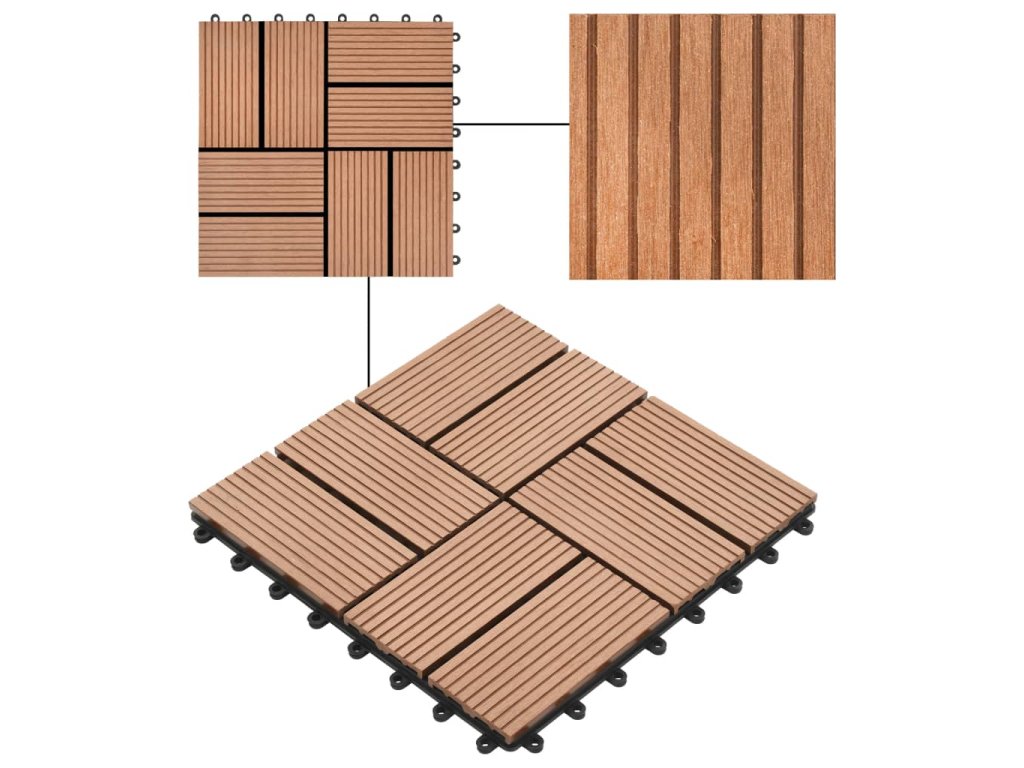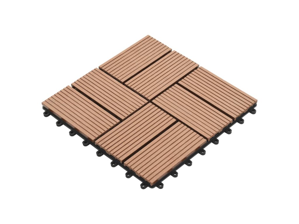 Tuto sadu terasových dlaždic z dřevoplastu tvoří 22 kusů samostatných dlaždic o velikosti 30 x 30 cm, které dohromady pokryjí celkový povrch o rozloze 2 metry čtverečné. Jsou ideální volbou na dvorky a balkony, k bazénu nebo k vířivce anebo třeba do koupelen.