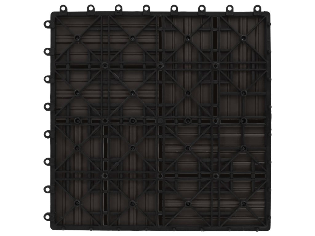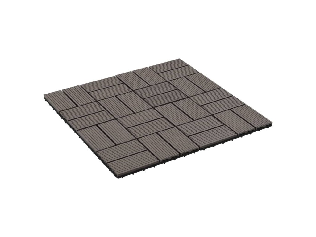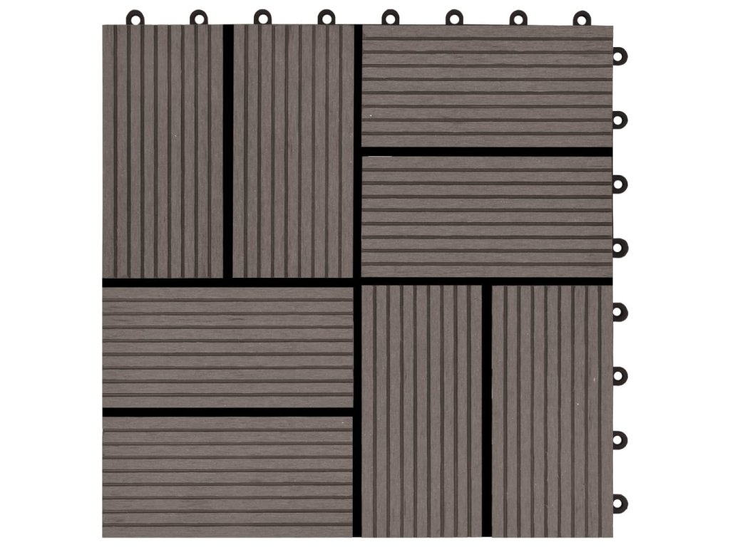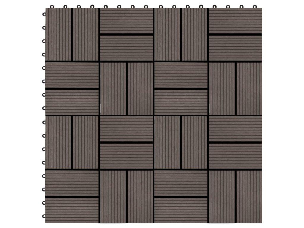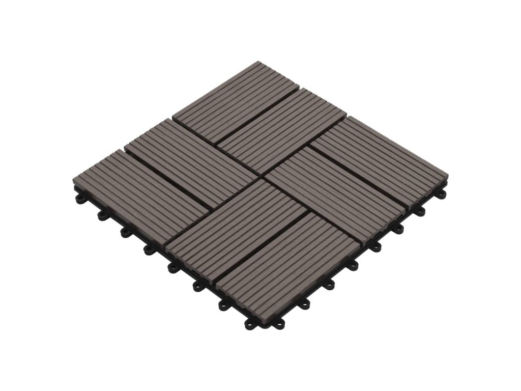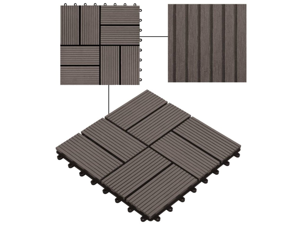 Tuto sadu terasových dlaždic z dřevoplastu tvoří 22 kusů samostatných dlaždic o velikosti 30 x 30 cm, které dohromady pokryjí celkový povrch o rozloze 2 metry čtverečné. Jsou ideální volbou na dvorky a balkony, k bazénu nebo k vířivce anebo třeba do koupelen.