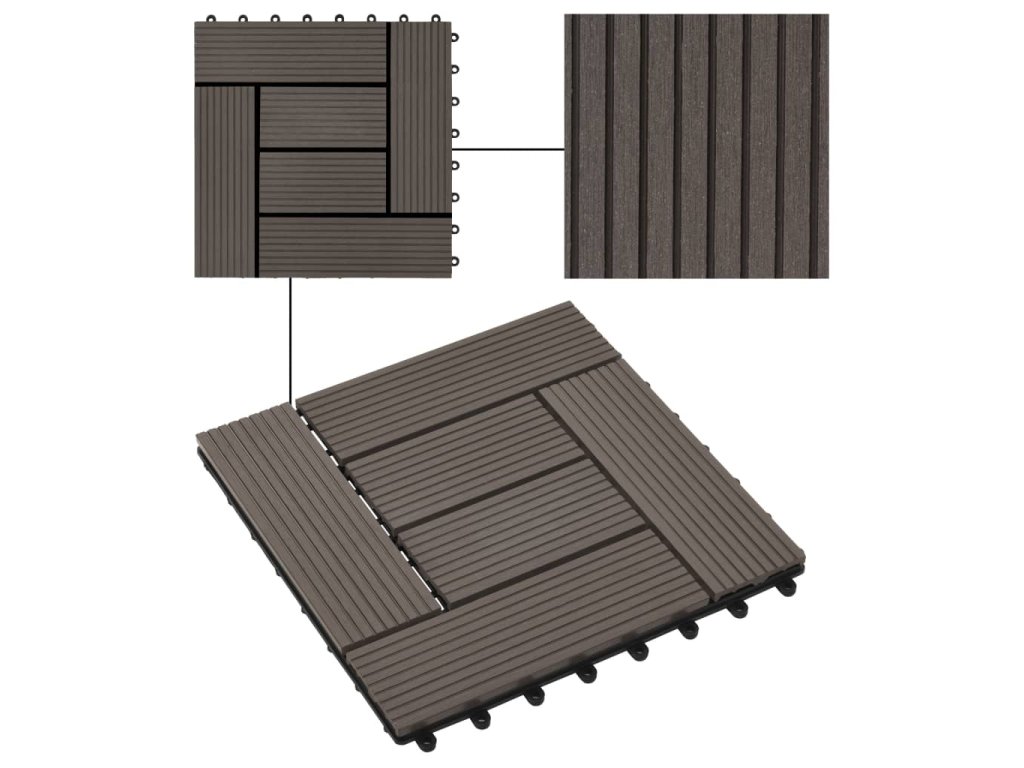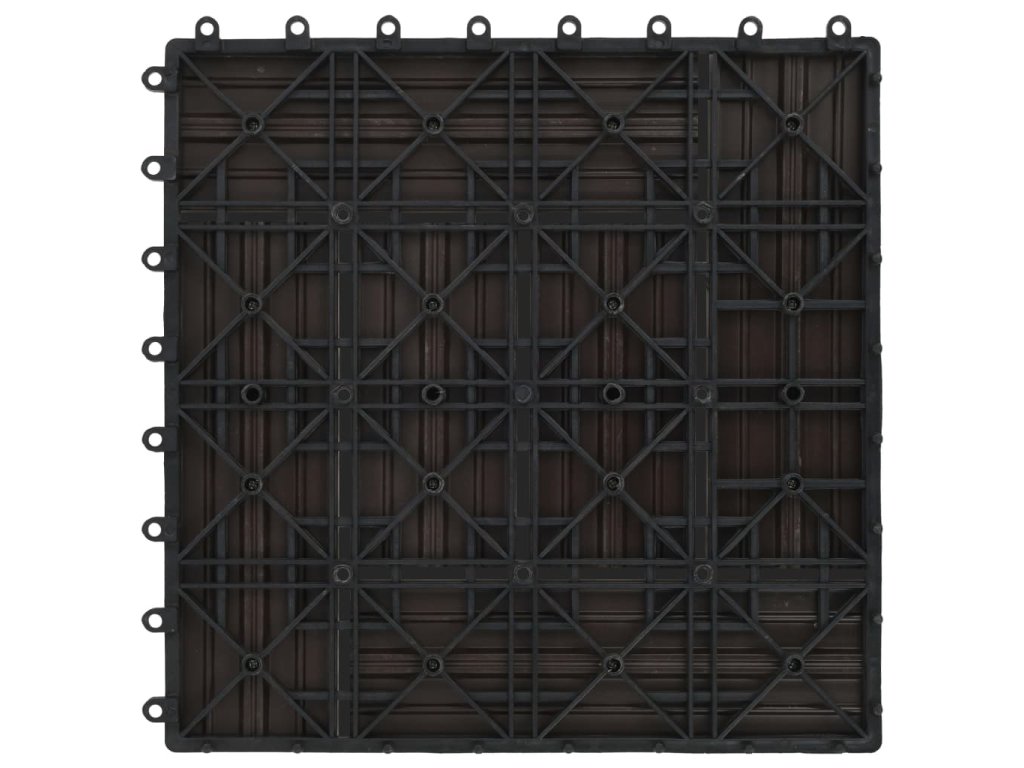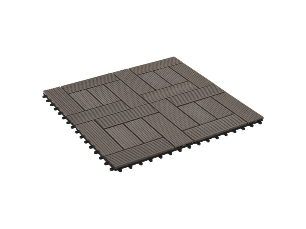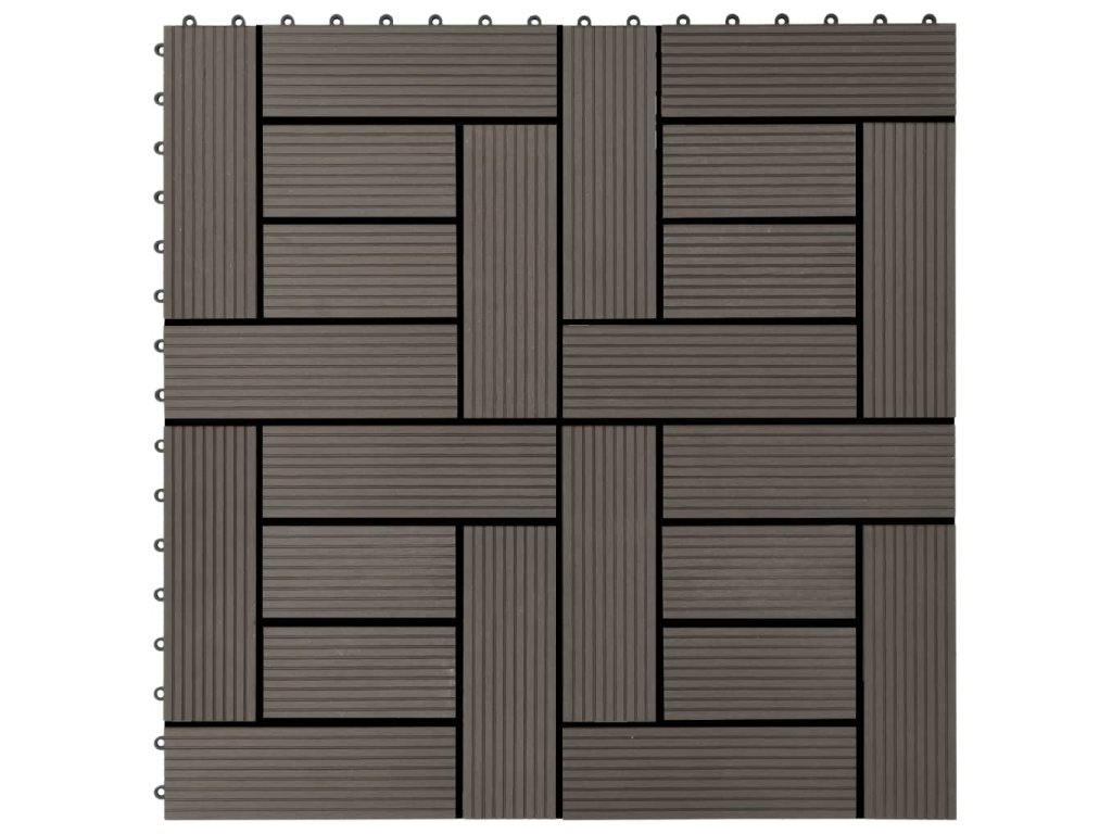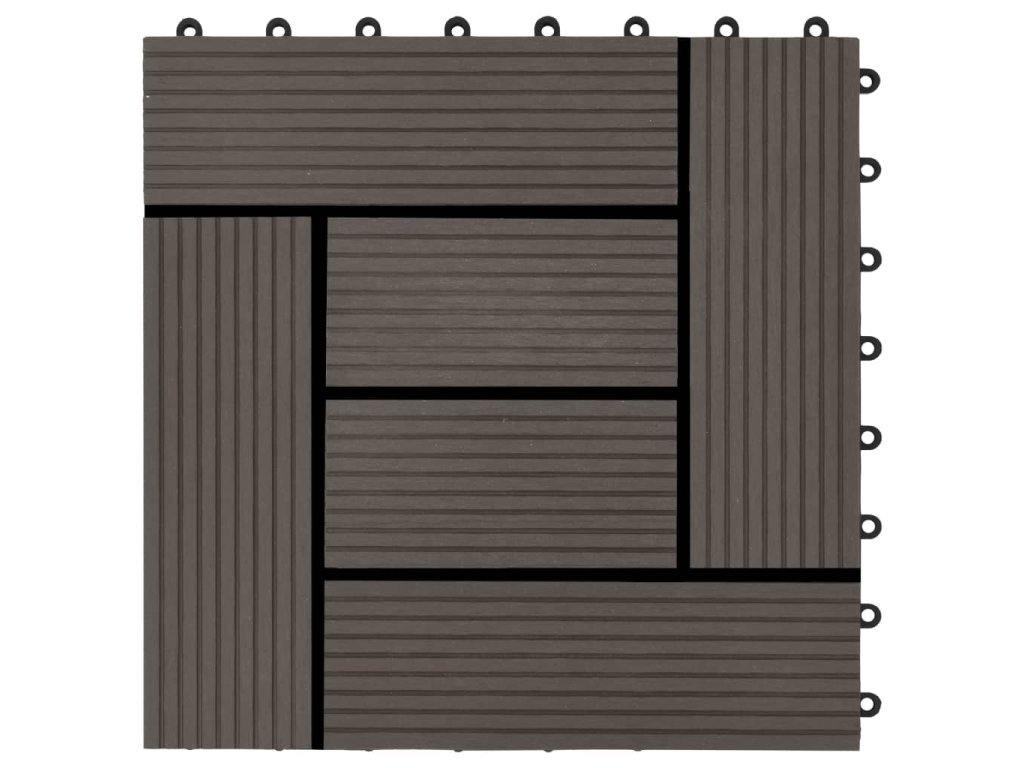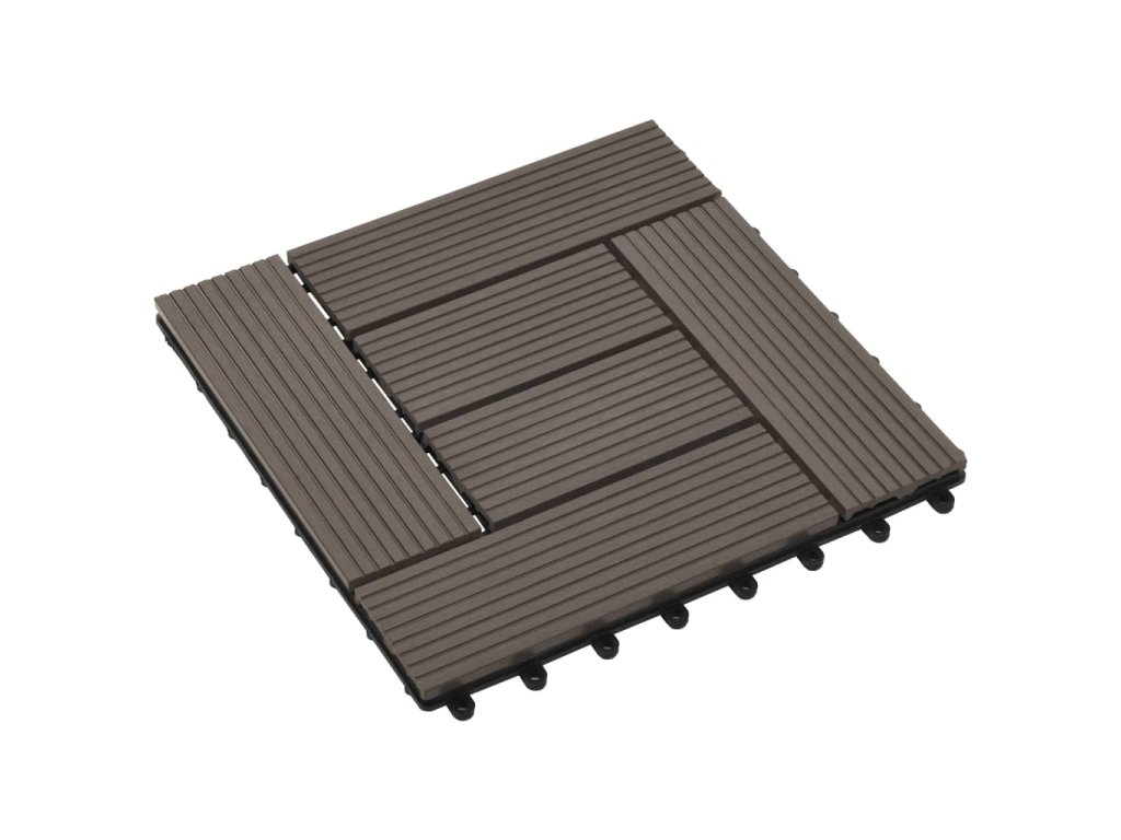 Tuto sadu terasových dlaždic z dřevoplastu tvoří 22 kusů samostatných dlaždic o velikosti 30 x 30 cm, které dohromady pokryjí celkový povrch o rozloze 2 metry čtverečné. Jsou ideální volbou na dvorky a balkony, k bazénu nebo k vířivce anebo třeba do koupelen.