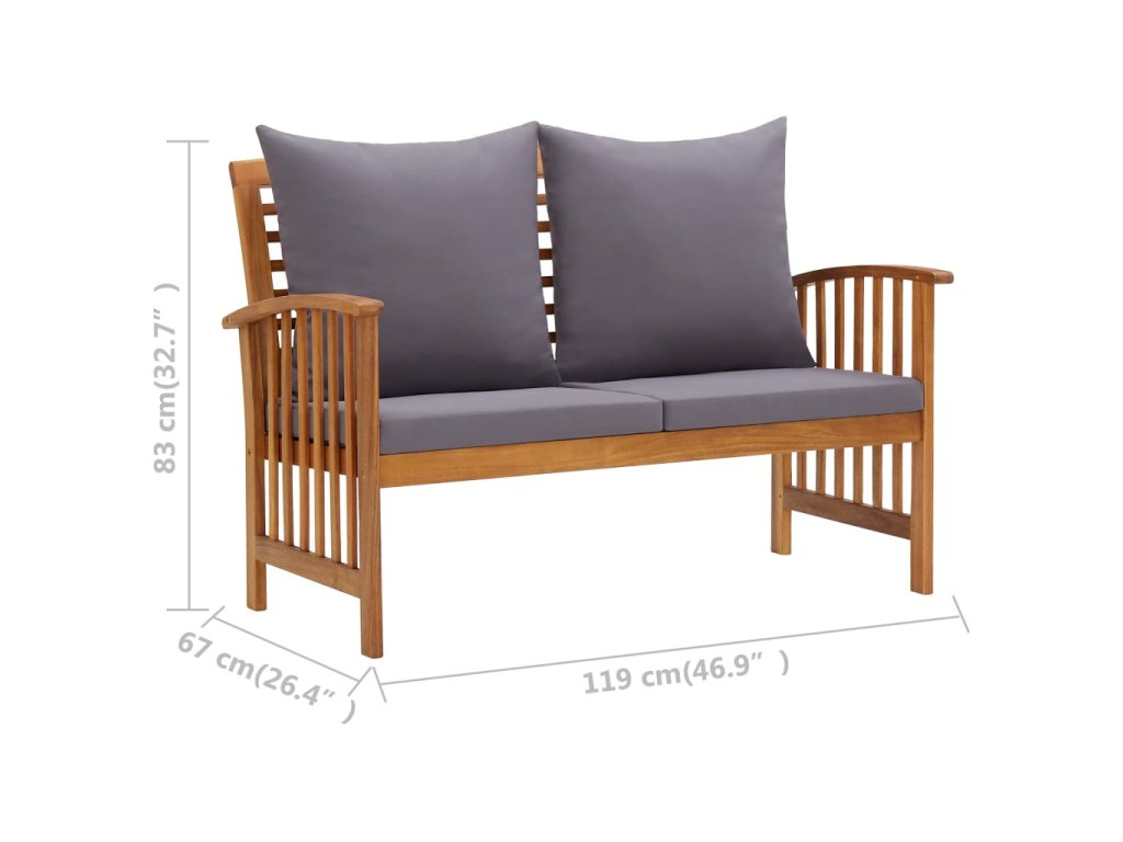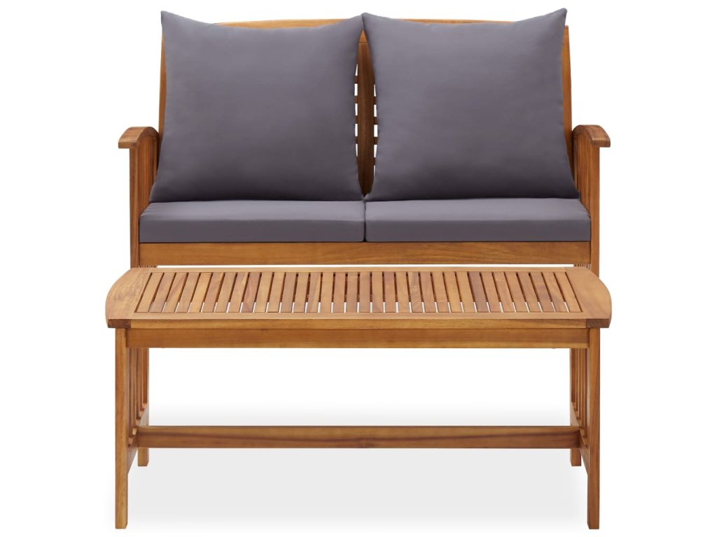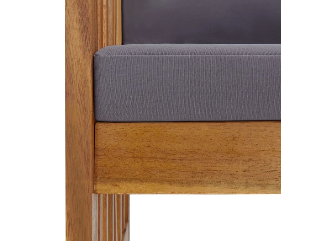 Set zahradního nábytku je zhotovený z masivního akáciového dřeva s olejovou úpravou, je stabilní a má dlouhou životnost. Konferenční stolek z masivní dřevěnou stolní deskou s lamelovým designem poslouží jako perfektní odkládací plocha pro vaše občerstvení, mísy s ovocem, dekorativní předměty a další nezbytnosti. Podušky na sedák a polštář za záda přispívají k pohodlnému posezení, stejně jako opěradlo a loketní opěrky.
