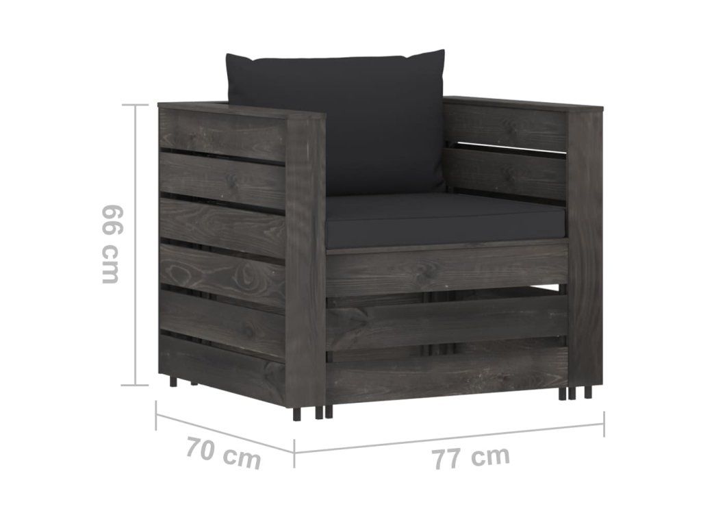 Sedací souprava z palet je zhotovená z impregnovaného borového dřeva, je tedy odolná a nepodléhá klimatickým vlivům. Zahradní sedací set má pevnou konstrukci a nevyžaduje téměř žádnou údržbu. Součástí balení jsou i měkké, silně polstrované podušky, sedací souprava je tudíž také velmi pohodlná. Modulární design soupravy umožňuje vytvářet různá uspořádání a kombinovat ji s dalšími modulárními segmenty podle vašich představ.