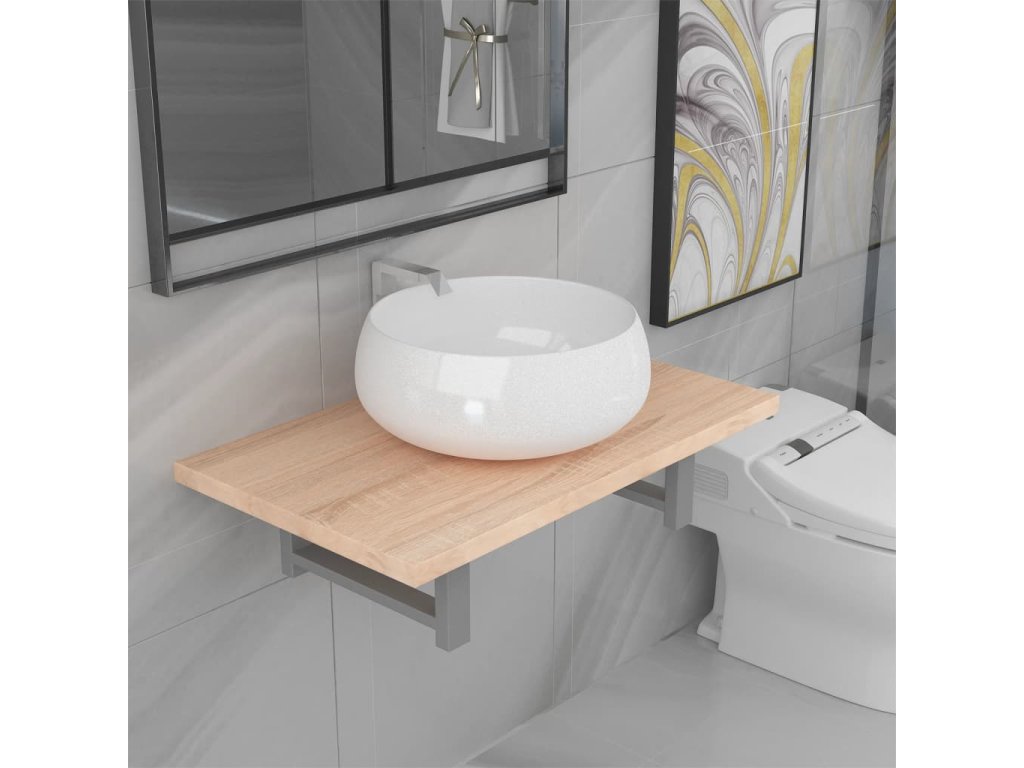 Koupelnová nástěnná police z pevného materiálu je výjimečně stabilní a odolná a perfektně doplňuje keramické umyvadlo. Toto keramické umyvadlo s vysoce lesklou povrchovou úpravou se snadno čistí vlhkým hadříkem. Polici můžete snadno upevnit ke zdi, potřebné držáky a montážní materiály jsou součástí balení.