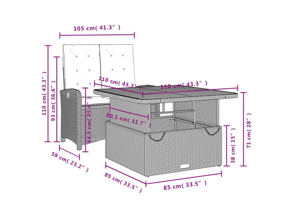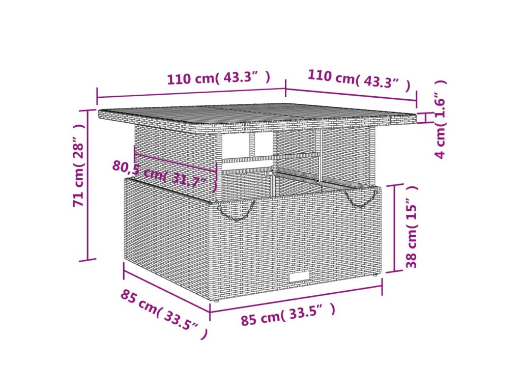 - Rozměry stolku: 110 x 110 x 40/71 cm (D x Š x V)