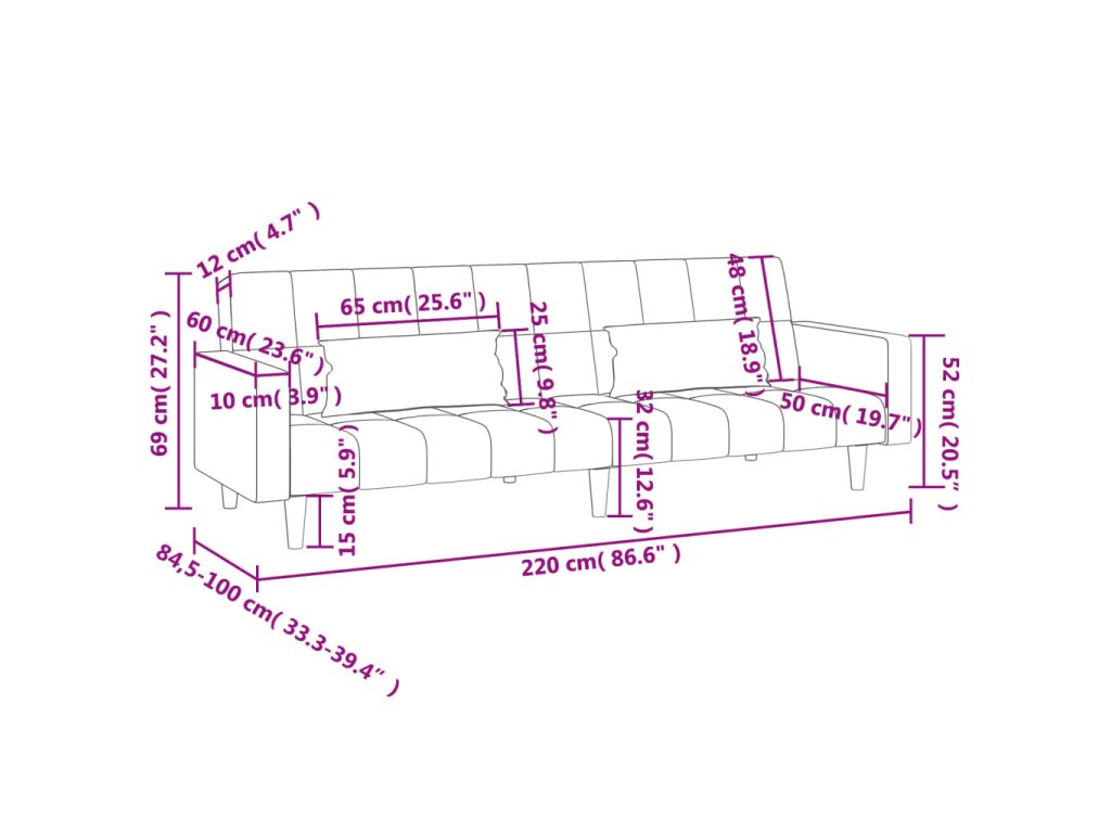 - Celkové rozměry: 220 x 84,5 x 69 cm (D x Š x V)