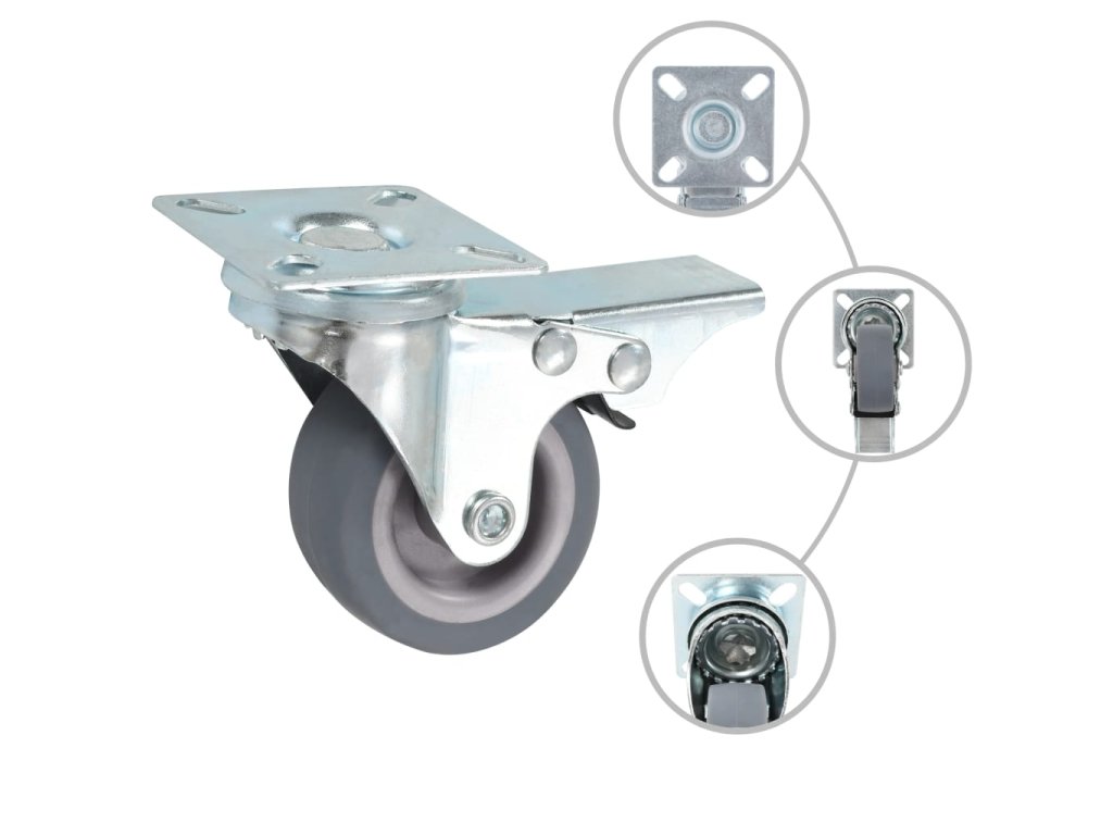 Kolečka jsou vyrobená z TPR (termoplastické gumy), která je známá pro svou schopnost pohlcovat nárazy a vibrace. Ať už tedy kolečka namontujete na cokoliv, budete to moci přesouvat hladce a v tichosti. Jejich hladký povrch navíc ochrání vaši podlahu před poškrábáním. Zinkem potažený ocelový rám je odolný proti rzi, dodává kolečkům na odolnosti a prodlužuje jejich životnost. Otočná kolečka jsou vybavená brzdou pro flexibilnější ovládání. Každé kolečko má maximální nosnost až 35 kg.