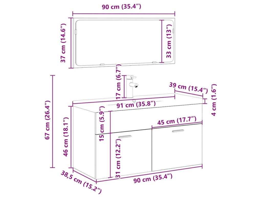 - Rozměry umyvadla: 91 x 39 x 18 cm (D x Š x V)