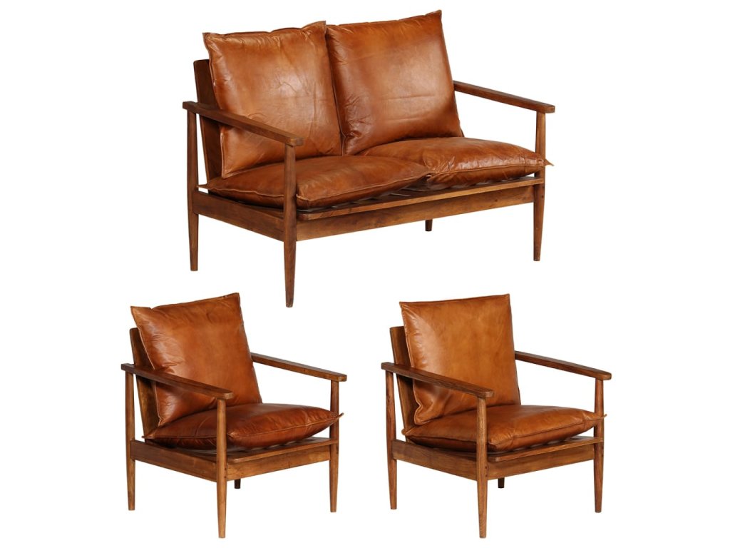 Pohovka je vyrobena z masivního akáciového dřeva, které bylo vyleštěno, natřeno a nalakováno. Ová povrchová úprava jí propůjčuje rafinovaný vzhled. Pohovka je celá ručně vyráběná a nádherná kresba dřeva činí každý kus nábytku jedinečným a lehce odlišným od ostatních. Tato sedací souprava z masivního dřeva je čalouněná měkkou kozí kůží se silným pěnovým polstrováním pro skvělý zážitek ze sezení. Navíc se snadno čistí vlhkým hadříkem.