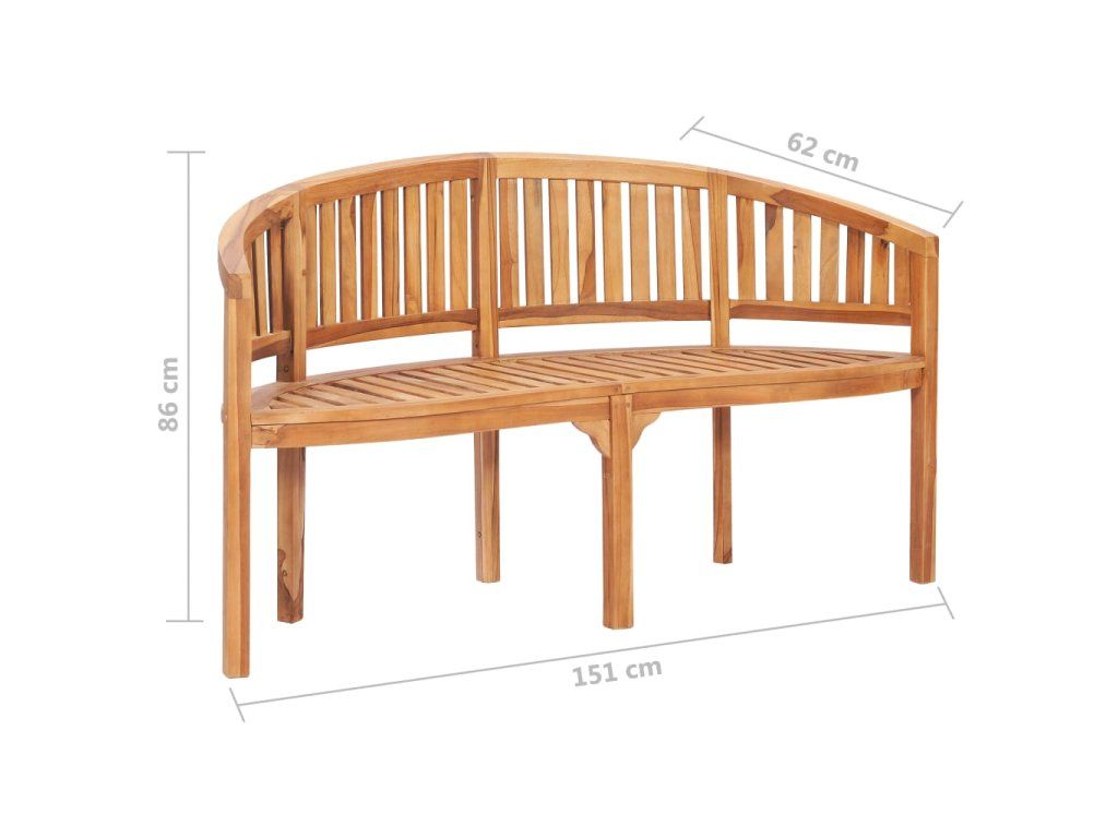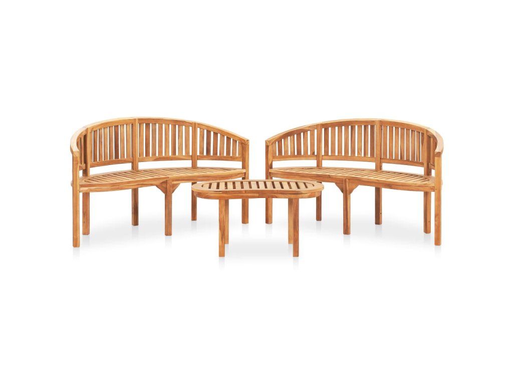 Nábytek je zhotovený z extrémně odolného teakového tvrdého dřeva, které již prošlo procesem smršťování, bylo uměle vysušené a poté jemně a dohladka obroušené. Toto dřevo je oceňované pro svou výjimečnou pevnost a klimatickou odolnost, a proto je zdaleka nejvhodnějším materiálem pro výrobu zahradního nábytku. Jedná se o skvělou volbu, pokud si chcete pořídit zahradní vybavení, které vám vydrží sloužit dlouhá léta. Zahradní stůl má bytelnou stolní desku v laťkovém designu. Design lavice ve tvaru banánu půvabně zdůrazňuje krásu této sedací soupravy.
