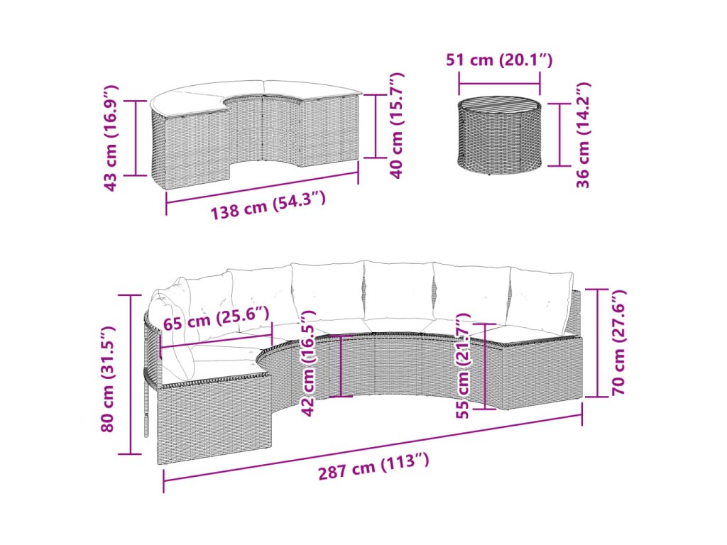 Tato půlkruhová zahradní sedací souprava je dokonalým doplňkem vaší zahrady, terasy nebo dvorku a poskytne vám pohodlné a příjemné místo, kde si můžete povídat s rodinou a přáteli nebo jen tak odpočívat a užívat si pobyt venku.