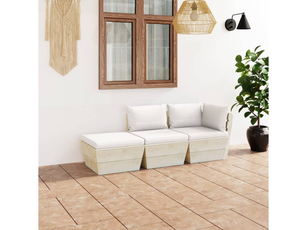 Na této 3dílné zahradní sedací soupravě z palet s poduškami si můžete skvěle odpočinout, užívat si krásného počasí, zdřímnout si nebo si povídat s rodinou či přáteli. Nadčasový design nábytky z palet vnese na vaši zahradu, terasu či do obývacího pokoje rustikální kouzlo.