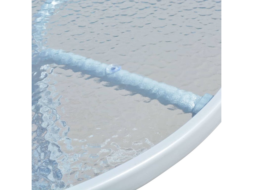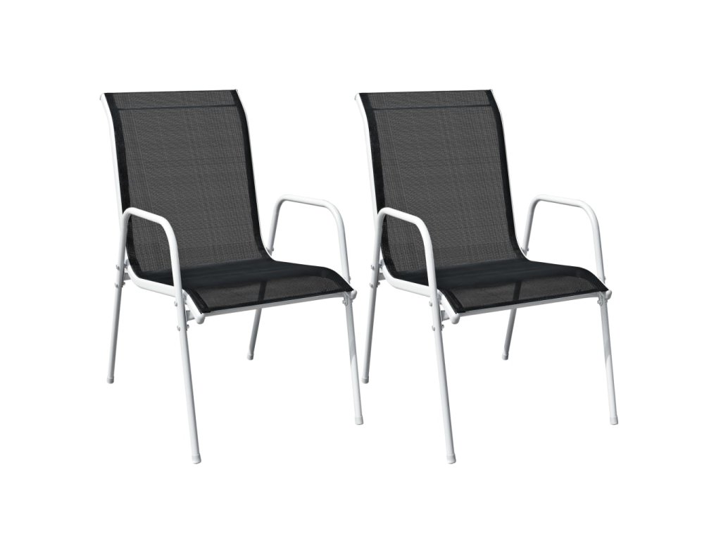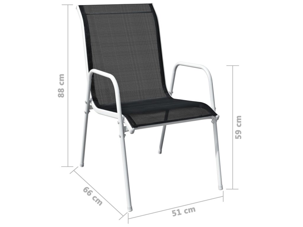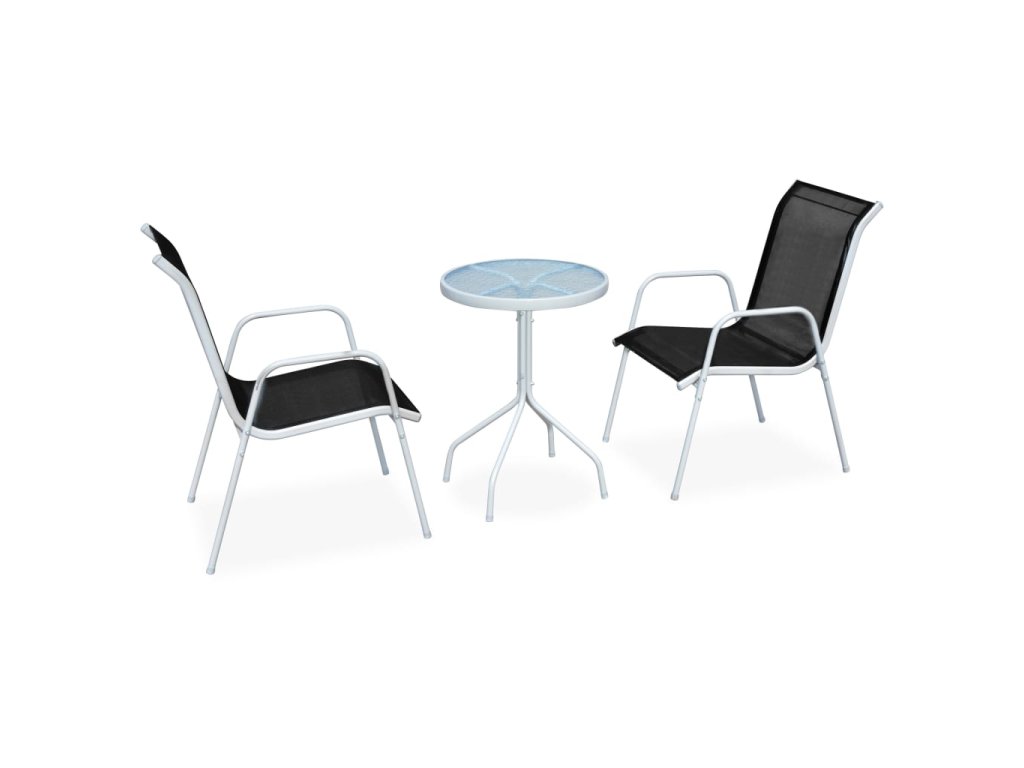 Komfortní židle jsou vyrobeny z kvalitní oceli s práškovým povrchem. Díky silné textilní látce jsou naše židle odolné proti povětrnostním vlivům a snadno se čistí. Židle jsou stohovatelné, aby ušetřily místo. Stůl má vrchní desku o tloušťce 5 mm vyrobenou z tvrzeného zvlněného skla, na kterou můžete umístit nápoje, občerstvení nebo dekorativní předměty. Má také robustní ocelový rám s práškovým povrchem, který je odolný a snadno se udržuje. Montáž je snadná.