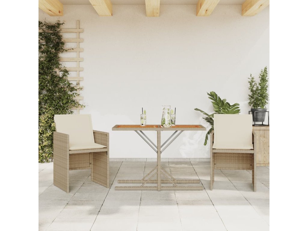 - Materiál: PE ratan, práškově lakovaná ocel, masivní akáciové dřevo s olejovou povrchovou úpravou