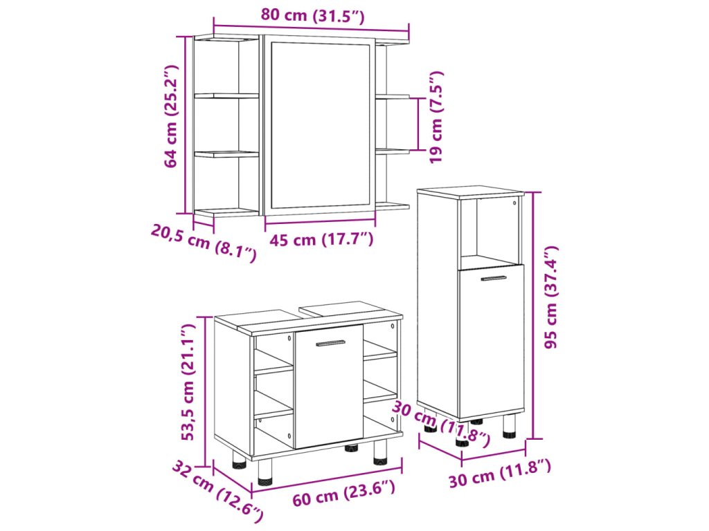 - Rozměry koupelnové skříňky (malá): 60 x 32 x 53,5 cm (Š x H x V)