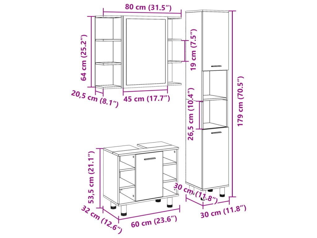- Rozměry koupelnové skříňky (malá): 60 x 32 x 53,5 cm (Š x H x V)