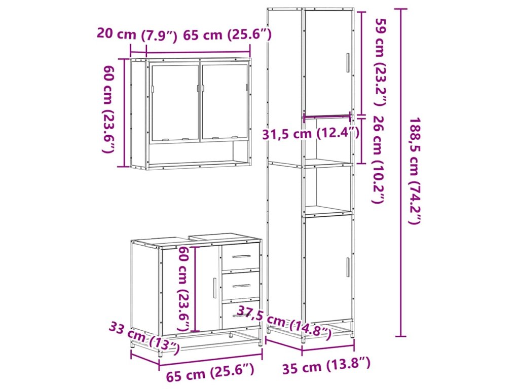 - Rozměry koupelnové skříňky: 35 x 37,5 x 188,5 cm (Š x H x V)