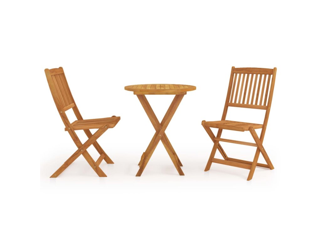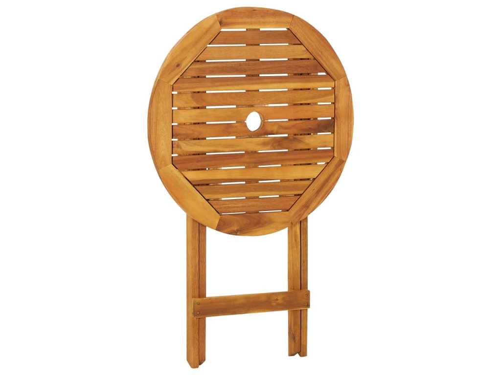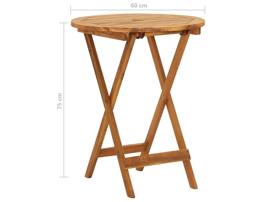 Tento jídelní set je vyrobený z masivního akáciového dřeva, je robustní a stabilní. Olejem napuštěný povrch nábytku snadno vyčistíte navlhčeným hadříkem. Uprostřed stolní desky je otvor pro slunečník. Jak jídelní stůl, tak i židle je možné složit, aby zbytečně nepřekážely, když je zrovna nepoužíváte.