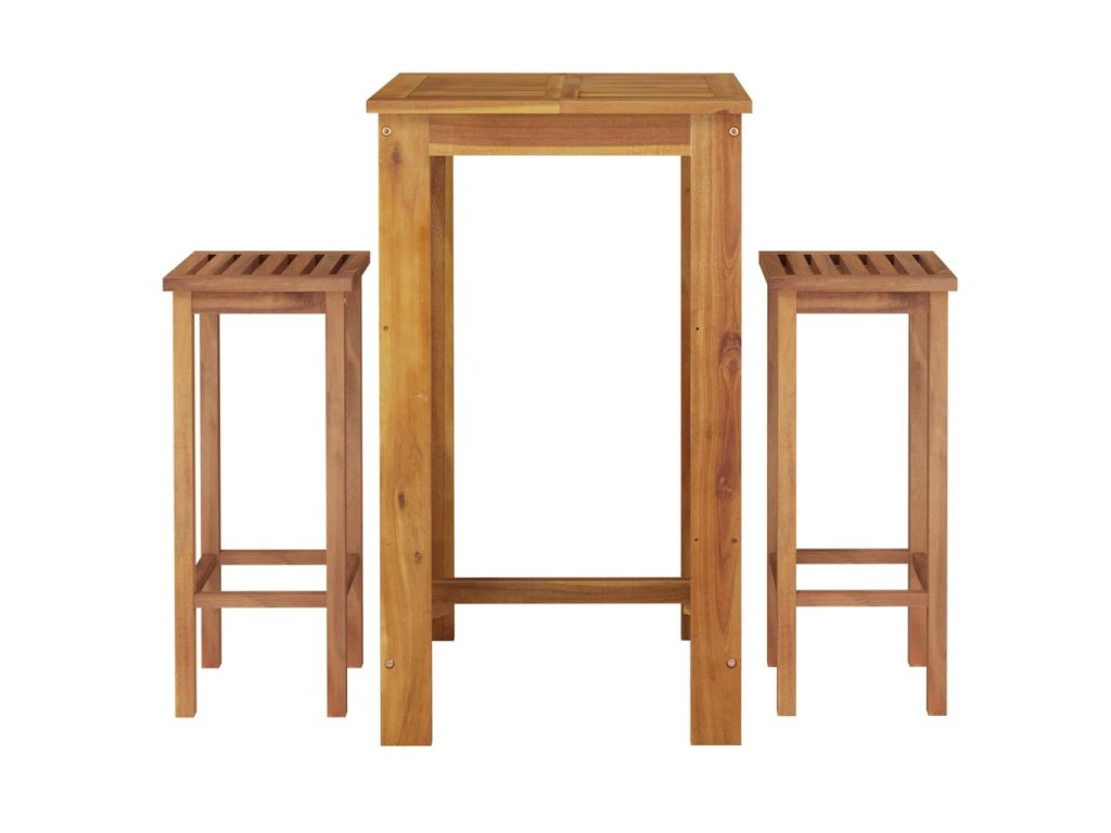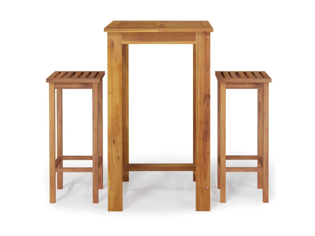 - Masivní akáciové dřevo: Masivní akáciové dřevo je krásný přírodní materiál. Akáciové dřevo je tropické tvrdé dřevo, které má hustou strukturu a je pevné a odolné. Tento barový set je zhotovený z masivního akáciového dřeva, je tedy vhodný pro vnitřní i venkovní použití.