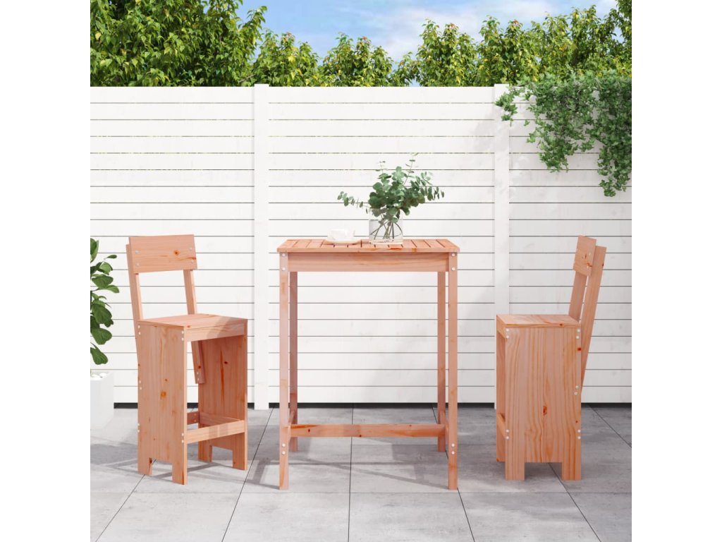 - Masivní dřevo douglasky: Tento barový set je vyroben z masivní douglasky. Masivní dřevo douglasky je vysoce odolný druh dřeva, který se výborně hodí pro venkovní použití. Dřevo douglasky je také pevné a vyžaduje minimum údržby i pod vlivem povětrnostních podmínek.