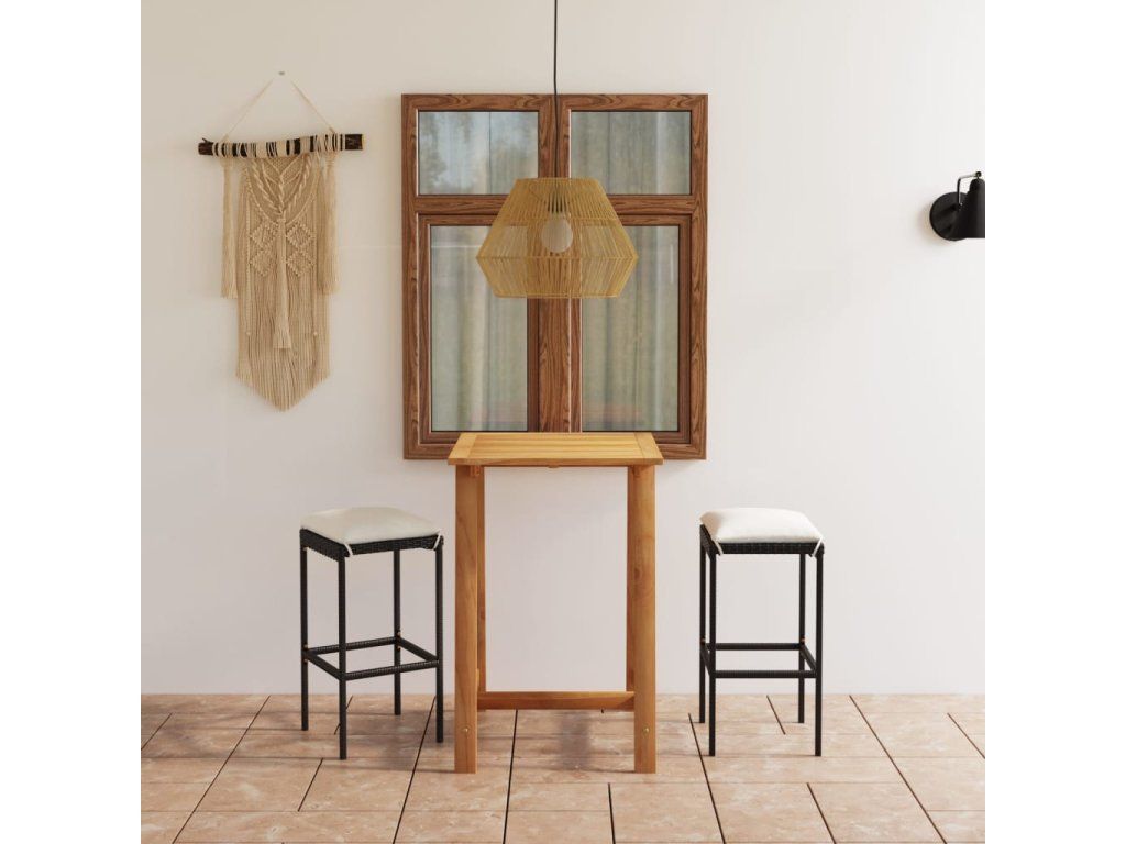 Stůl je zhotovený z masivního akáciového dřeva s olejovaným povrchem, takže je stabilní, odolný a nenáročný na údržbu. Barová stolička má rám z práškově lakované oceli, opletený PE ratanem, který výborně vzdoruje klimatickým vlivům. Dlouho vám proto vydrží a snadno ji očistíte. Tlusté odnímatelné podušky na sedák jsou mimořádně pohodlné. Jejich polyesterové potahy jsou opatřené zipy, aby je šlo jednoduše stáhnout a oprat.