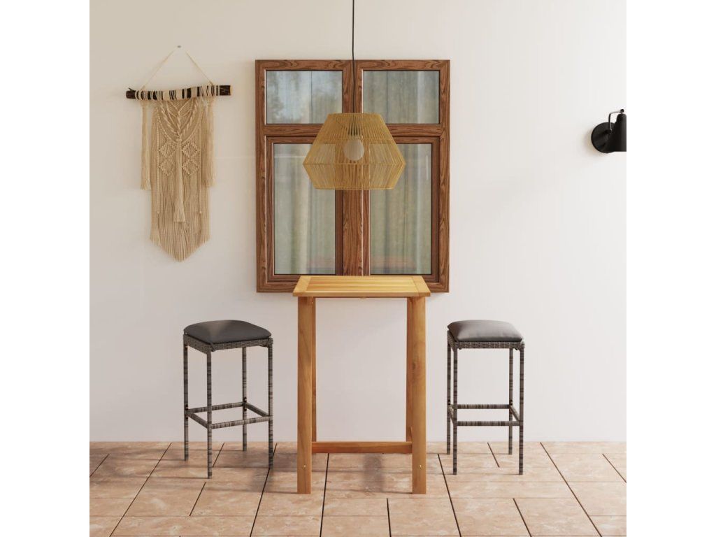 Stůl je zhotovený z masivního akáciového dřeva s olejovaným povrchem, takže je stabilní, odolný a nenáročný na údržbu. Barová stolička má rám z práškově lakované oceli, opletený PE ratanem, který výborně vzdoruje klimatickým vlivům. Dlouho vám proto vydrží a snadno ji očistíte. Tlusté odnímatelné podušky na sedák jsou mimořádně pohodlné. Jejich polyesterové potahy jsou opatřené zipy, aby je šlo jednoduše stáhnout a oprat.